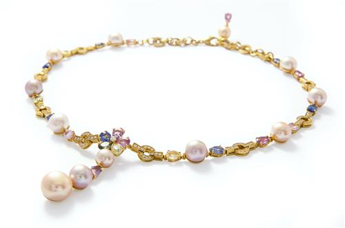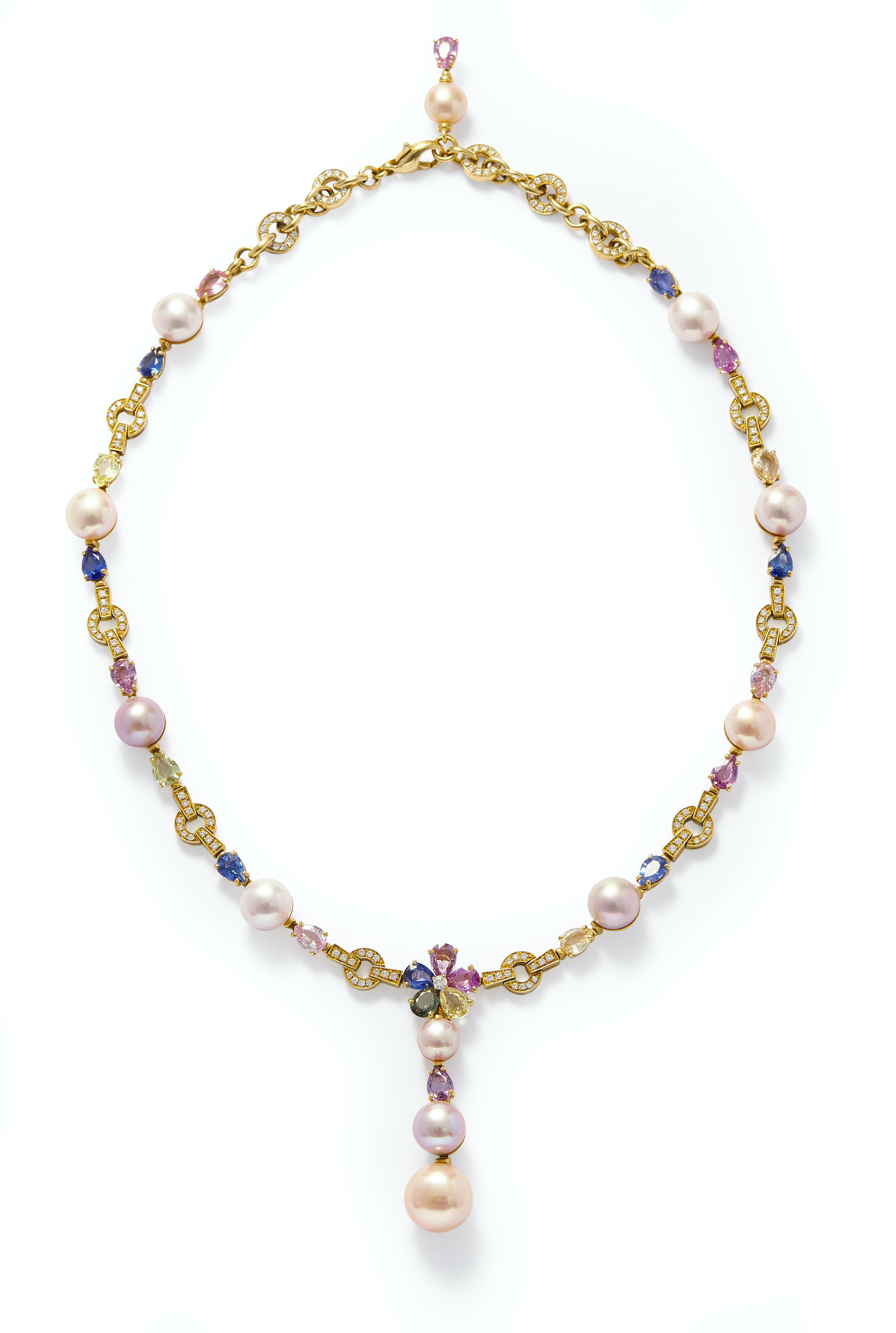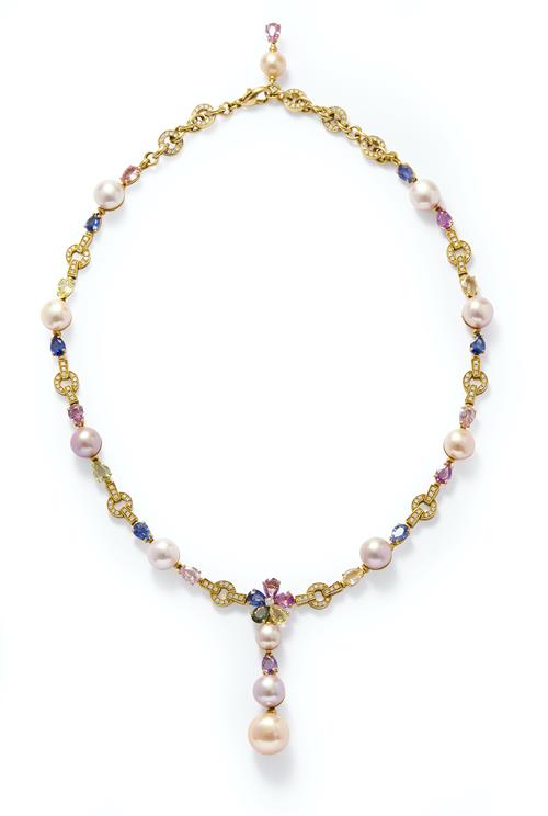 The collar designed as a line of geometric links pavé-set with brilliant-cut diamonds, alternating between claw-set variously coloured pear-shaped sapphires and cultured pearls, centring a flower head, the stamen claw-set with a brilliant-cut diamond, the petals similarly set with variously coloured sapphires supporting a similarly set flower head swing drop between a sapphire and pearl connector, the diamonds together weighing approximately 4.00 carats, inner circumference adjustable from approximately 390mm to 430mm, signed Bulgari, Italian workshop registration and maker's marks.