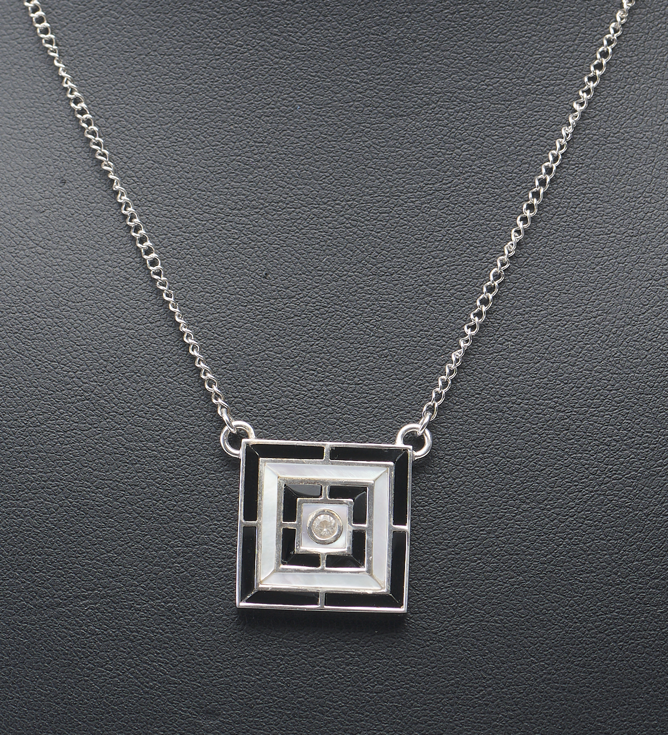 A MOTHER OF PEARL, ONYX AND CUBIC ZIRCONIA NECKLACE IN SILVER, TOTAL LENGTH 480MM