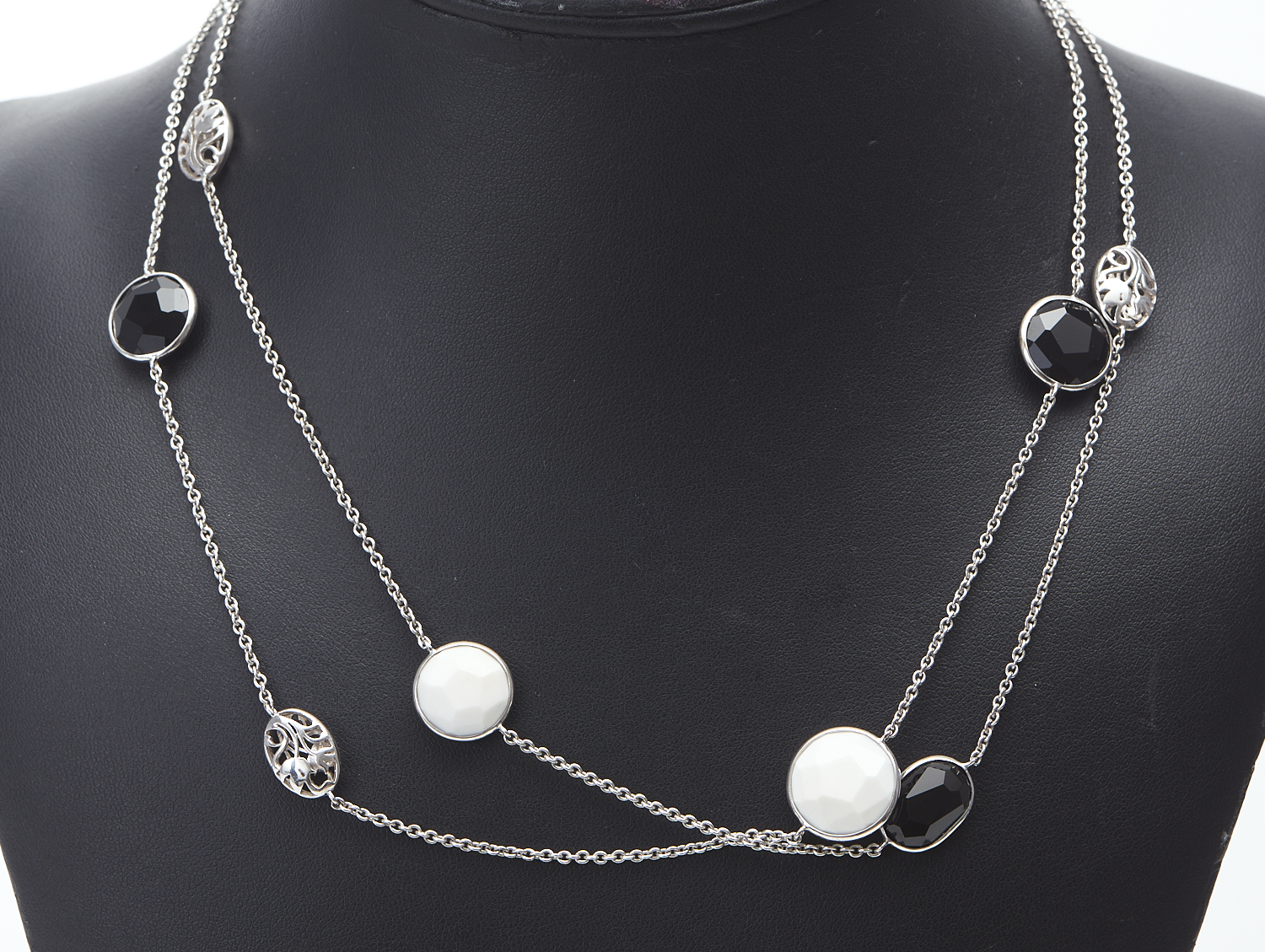 A LONG ONYX, AND WHITE STONE NECKLACE IN SILVER, LENGTH 800MM INCLUDING CLASP
