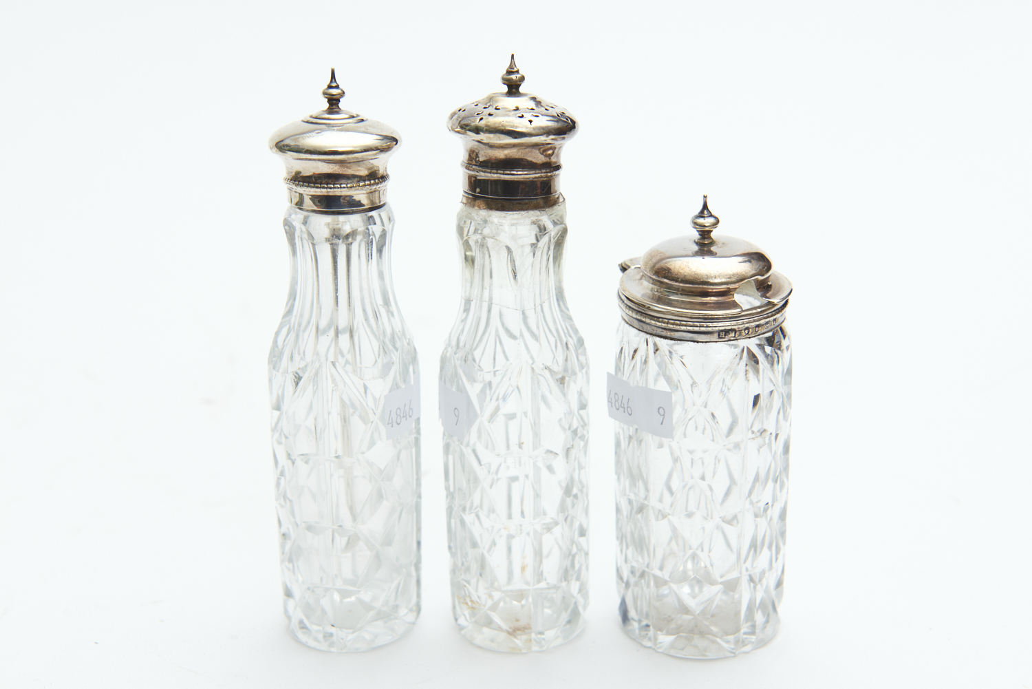THREE SILVER MOUNTED VICTORIAN CONDIMENT BOTTLES INCLUDING A MUSTARD POT, THE TALLEST 14.5 CM HIGH, LEONARD JOEL LOCAL DELIVERY SIZE: SMALL