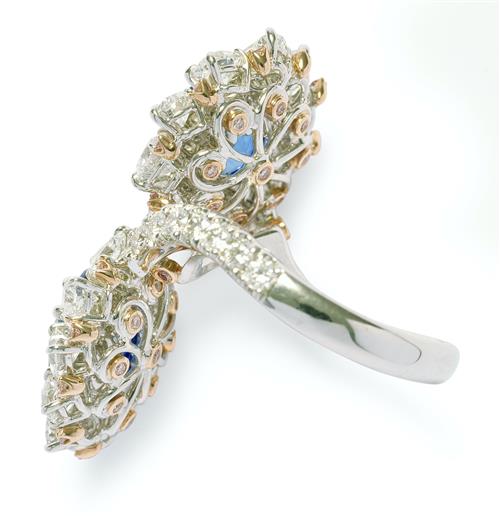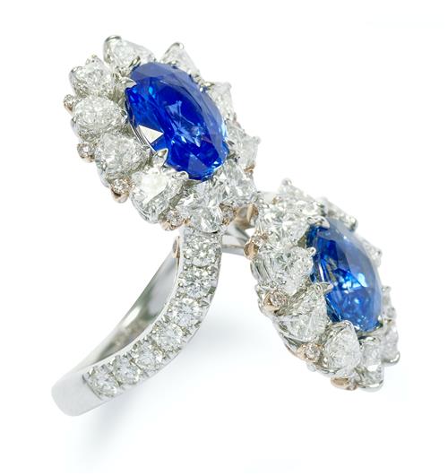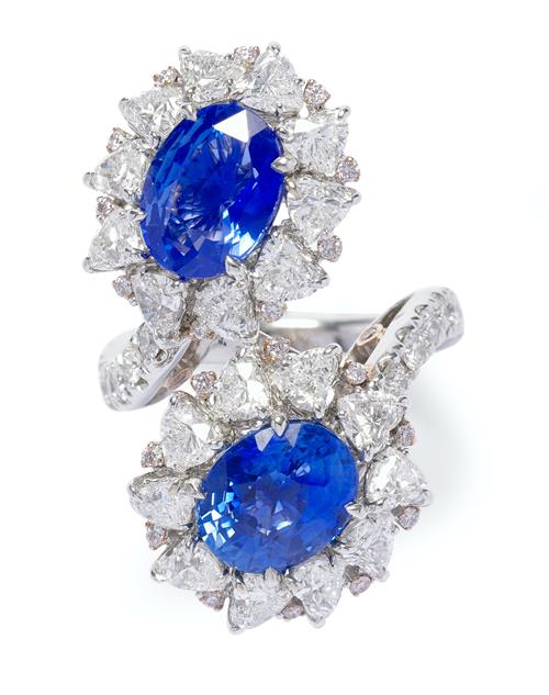 Of toi et moi design with cluster terminals, claw-set with oval sapphires weighing 3.60 carats and 3.11 carats respectively, framed by claw-set heart-shaped near colourless diamonds between collet-set brilliant-cut Argyle natural fancy purplish pink diamonds, the underrail modelled as openwork scrolls pavé-set with Argyle natural fancy purplish pink diamonds to shoulders accented by brilliant-cut near colourless diamonds, the near colourless diamonds and fancy purplish pink diamonds together weighing approximately 0.59 carat and 0.29 carat respectively, size N1/2.