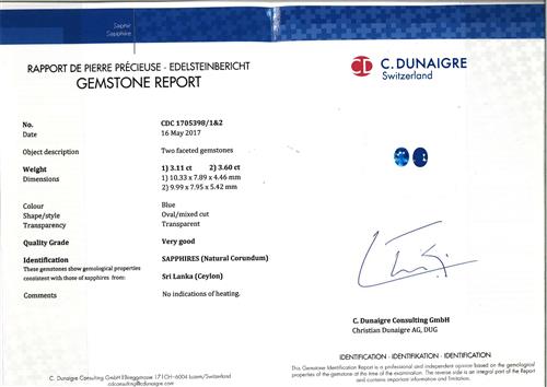 Accompanied by a C. Dunaigre report numbered CDC 1705398/1&2, dated 16 May 2017, stating that the 3.11 carat and 3.60 carat sapphires are natural, of Ceylon (Sri Lanka) origin, with no evidence of heat treatment.