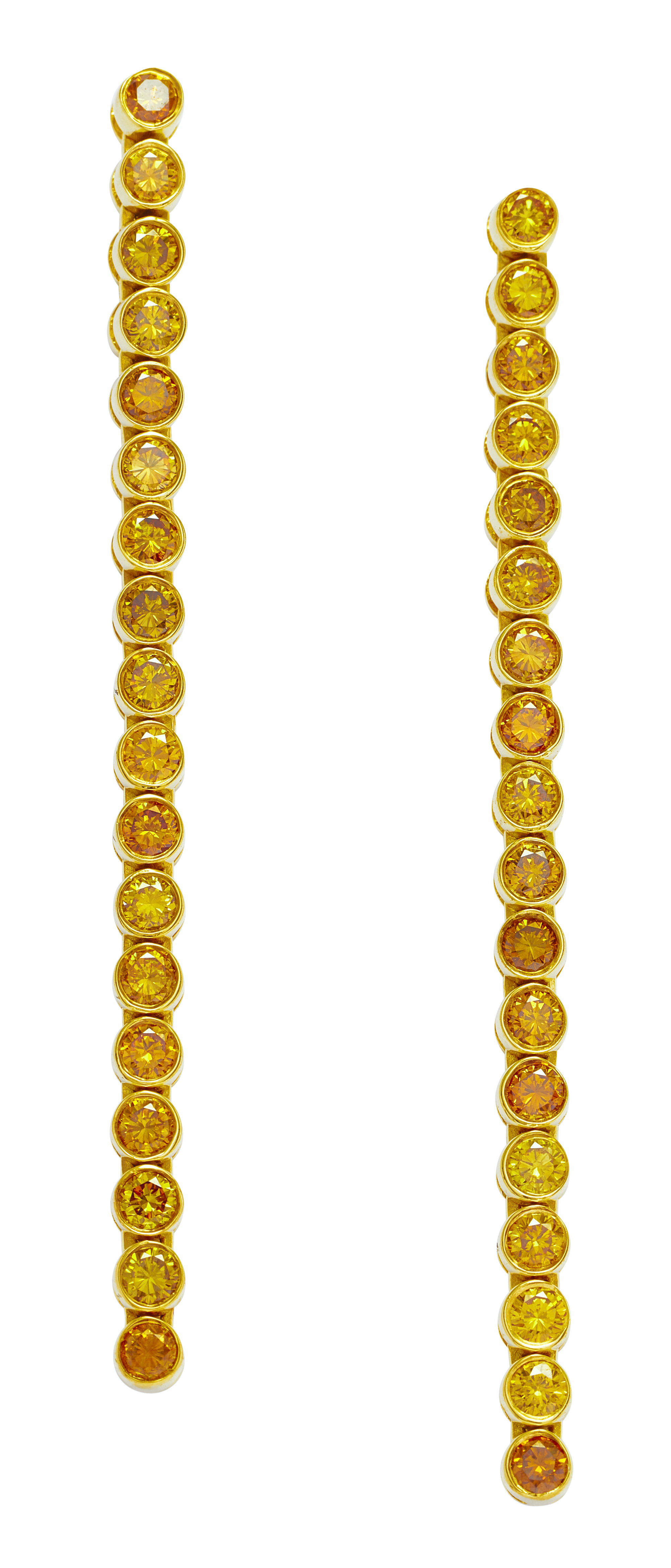 Each terminating on an articulated line of 17 collet-set natural fancy intense to fancy deep yellowish-brown brilliant-cut diamonds suspended from a similarly set surmount, the diamonds together weighing approximately 1.80 carats, length approximately 56mm, post fittings.