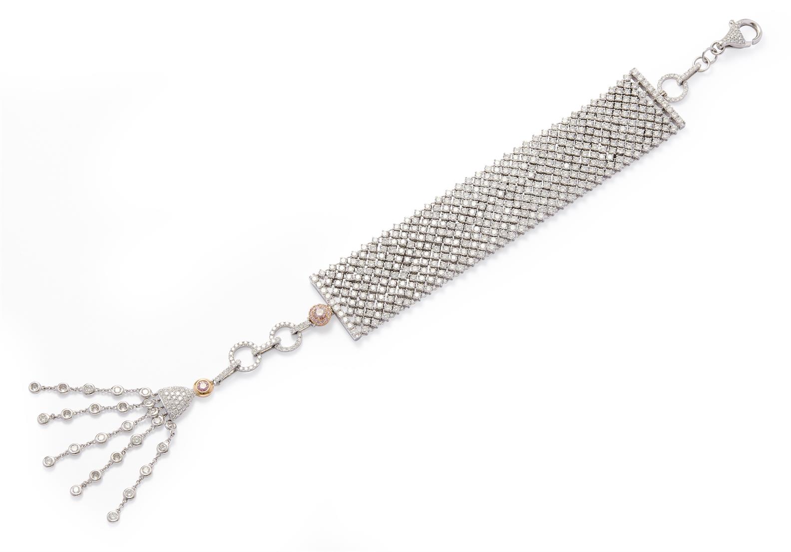 Centring a wide strap embellished with brilliant-cut diamonds, flanked by connectors decorated with near colourless and Argyle natural fancy intense pink brilliant-cut diamonds, the clasp supporting a tassle of spectacle-set diamonds, the diamonds together weighing approximately 22.06 carats, length approximately 200mm, adjustable.