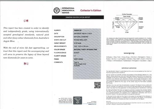 Accompanied by an IGI report numbered 355945138, dated 5 March 2019, stating that the 0.18 carat natural fancy intense pink diamond is I1 clarity and is of origin Argyle mine, Australia.