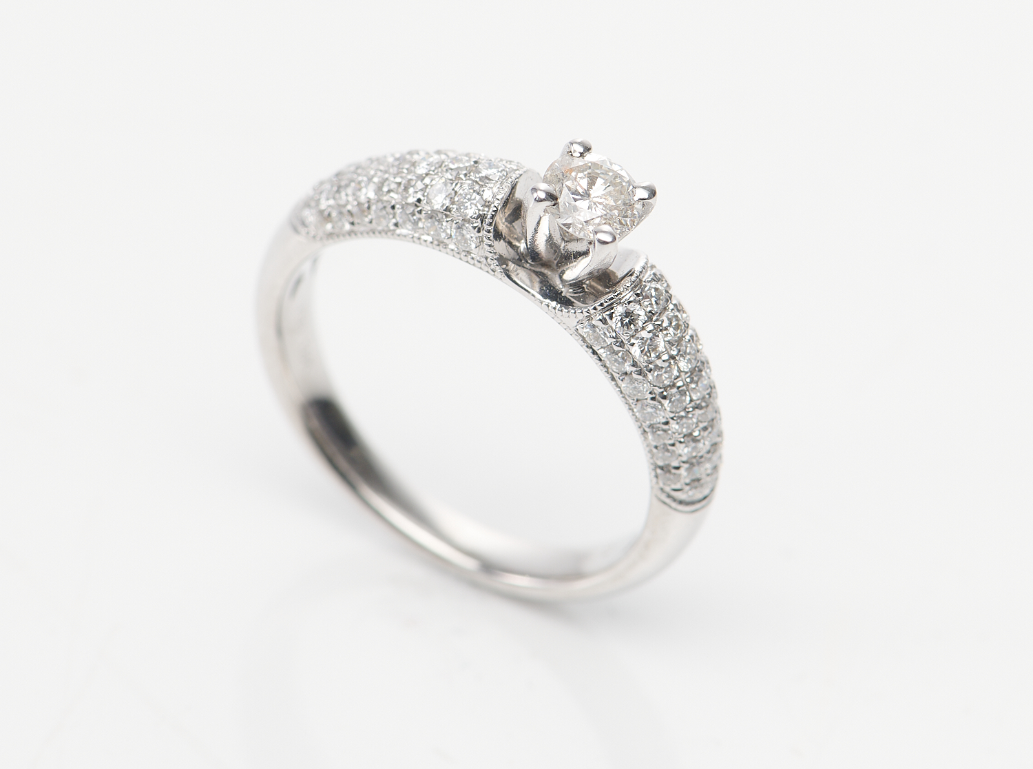 A DIAMOND DRESS RING IN 18CT WHITE GOLD, DIAMONDS TOTALLING APPROXIMATELY 0.82CTS, SIZE L-M, 4GMS