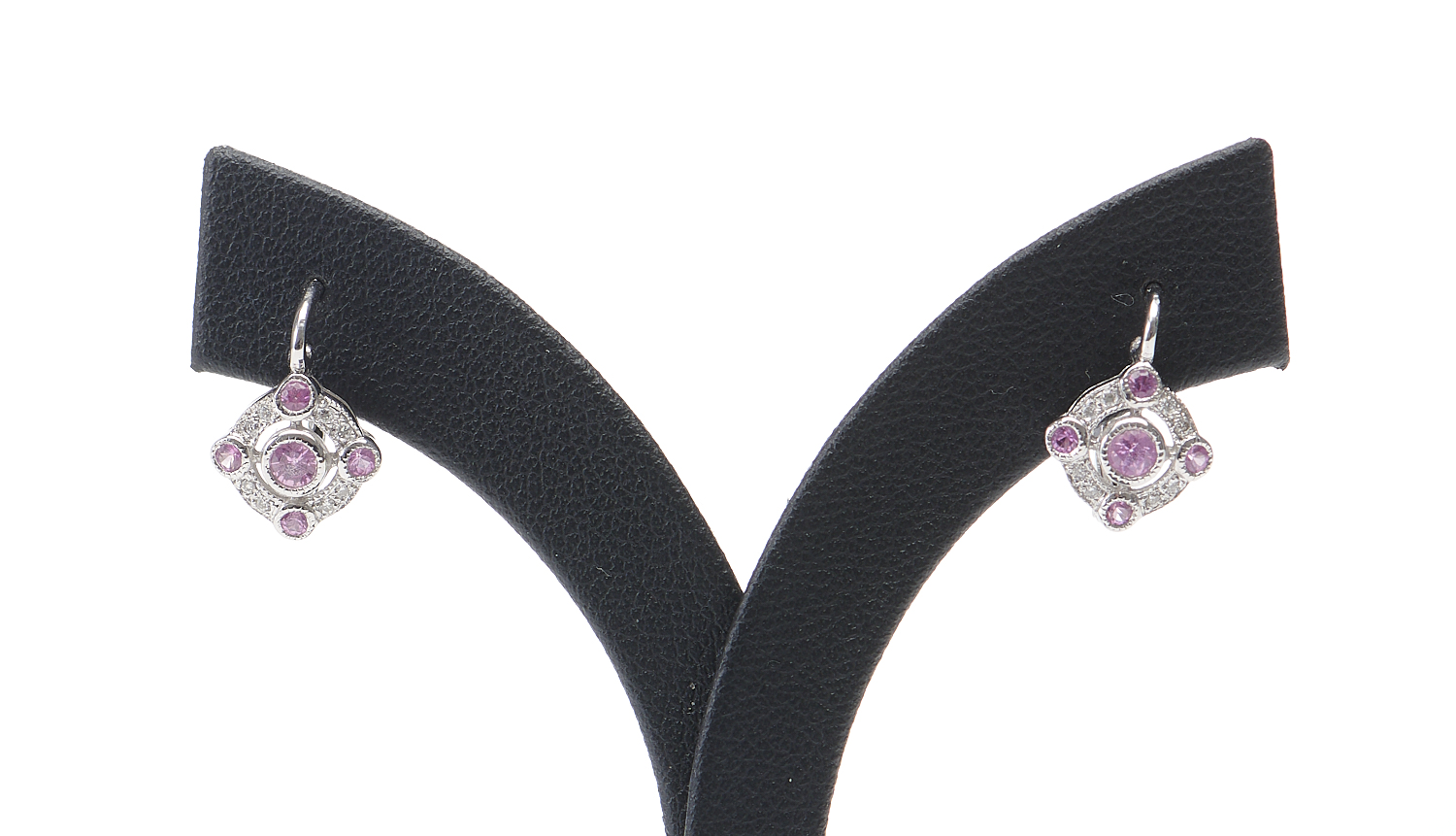A PAIR OF PINK SAPPHIRE AND DIAMOND EARRINGS, TO CONTINENTAL FITTINGS, IN 9CT WHITE GOLD, 1.6GMS