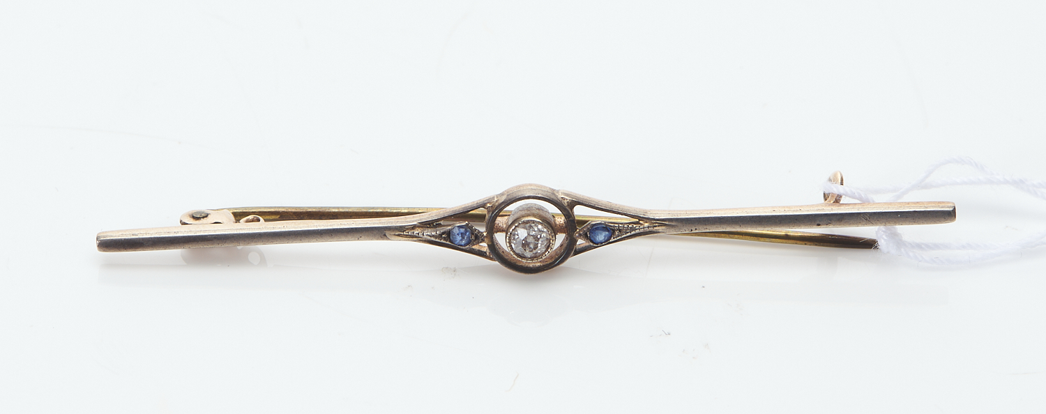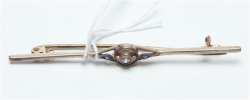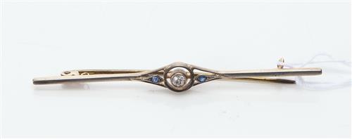AN ART DECO DIAMOND AND SAPPHIRE BAR BROOCH FEATURING AN OLD CUT DIAMOND, IN 15CT GOLD AND PLATINUM, LENGTH 62MM, 2.38GMS