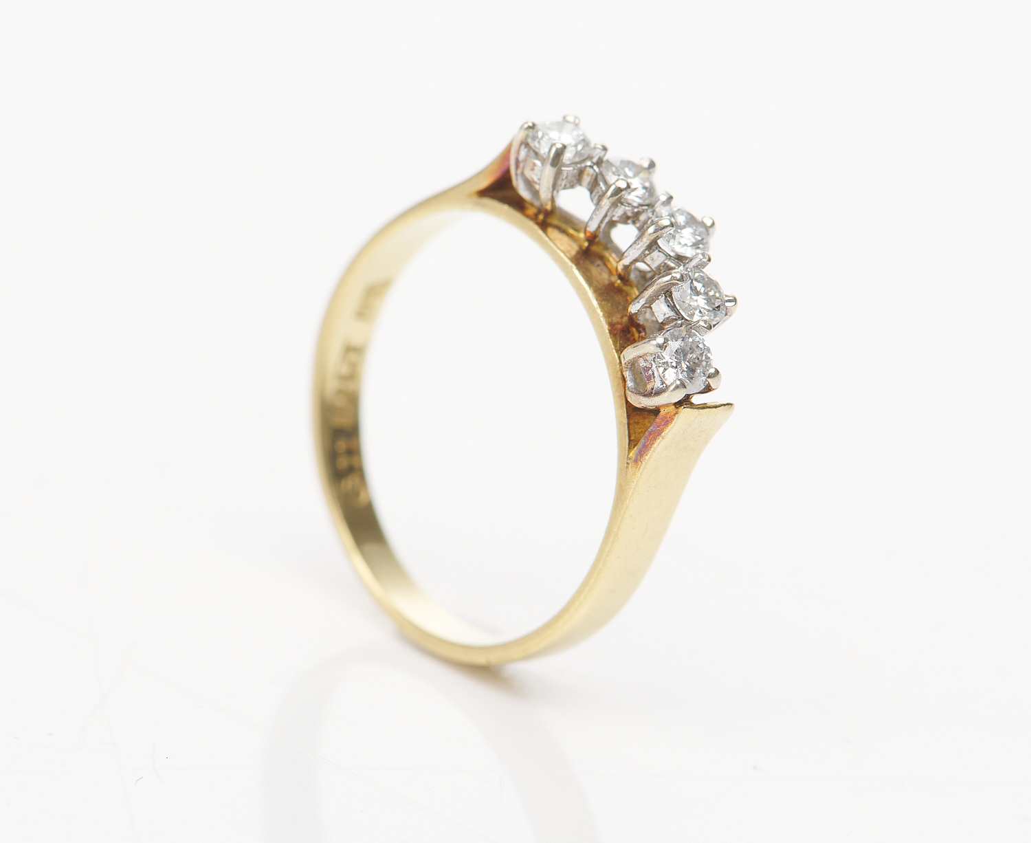 A CURVED DIAMOND RING IN 18CT GOLD, THE DIAMONDS TOTALLING 0.30CTS, SIZE K-L, 2.6GMS