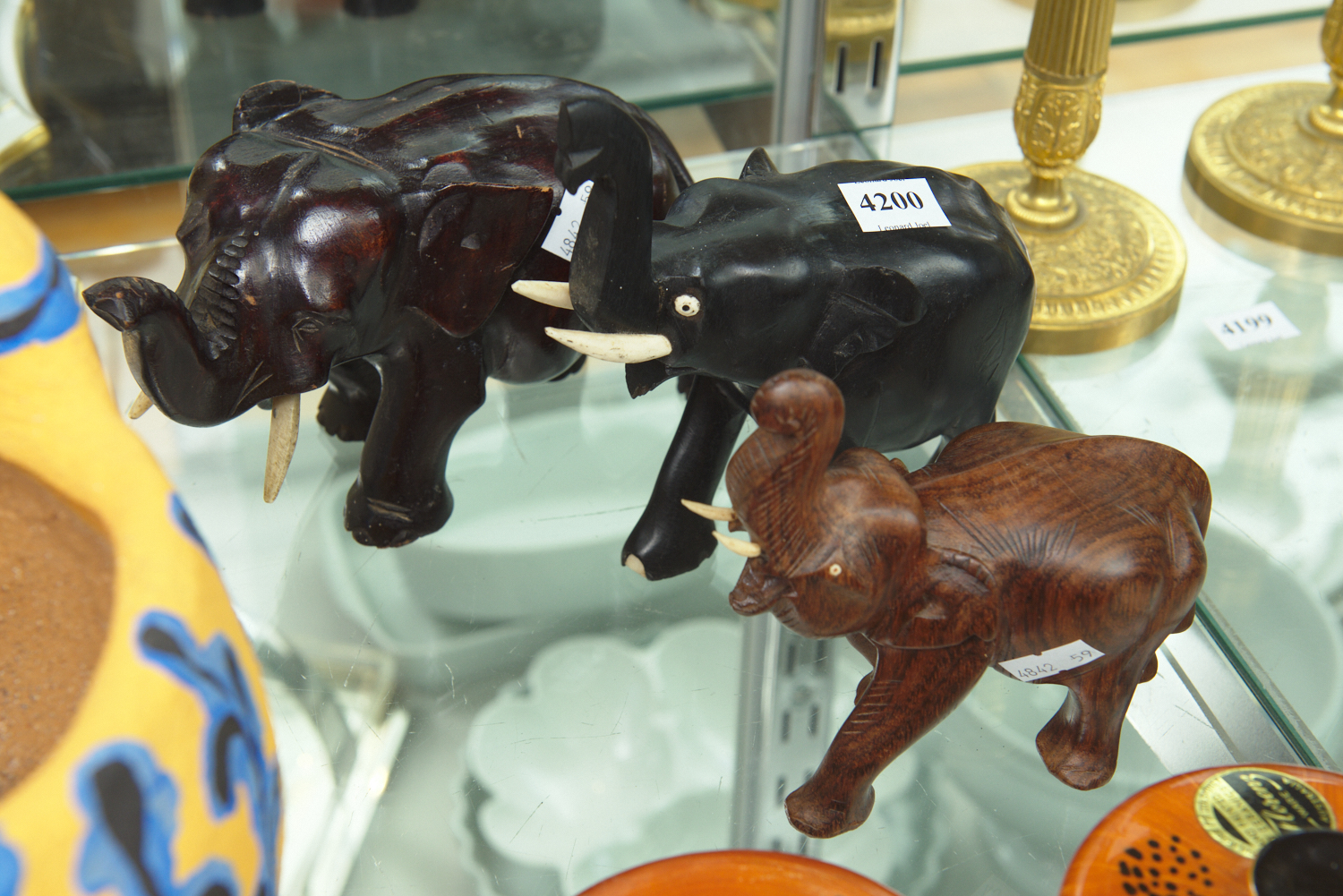 A GROUP OF THREE CARVED ELEPHANTS INCLUDING ONE EBONY, TALLEST H. 17CM, LEONARD JOEL LOCAL DELIVERY SIZE: SMALL