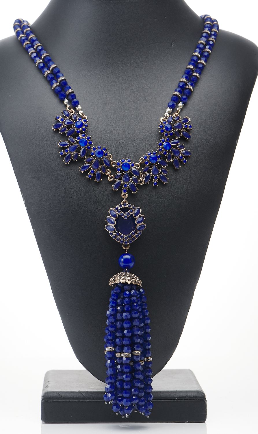 A VINTAGE STYLE BLUE BEAD AND CRYSTAL NECKLACE WITH TASSEL FEATURE, TOTAL LENGTH 51CMS