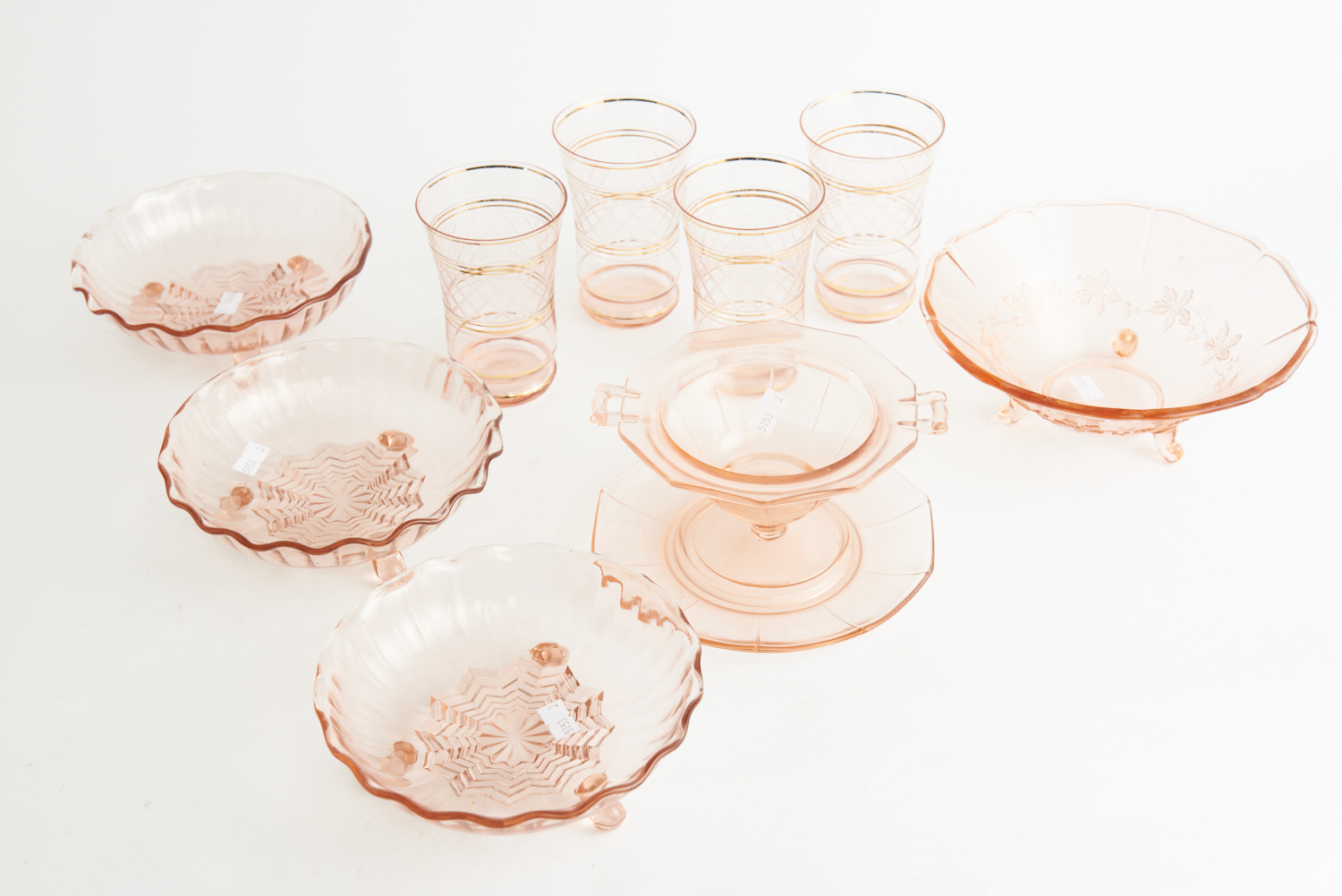 A COLLECTION OF VINTAGE PINK DEPRESSION GLASS INCLUDING BOWLS, COMPORT AND SET OF FOUR TUMBLERS, LEONARD JOEL LOCAL DELIVERY SIZE: SMALL
