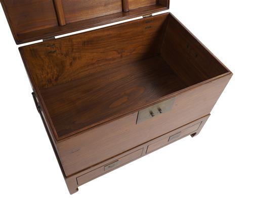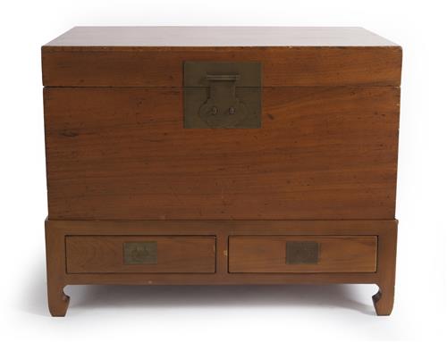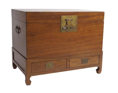 Each with large brass escutcheons to the front, handles to either side, and resting on a stand with two drawers.