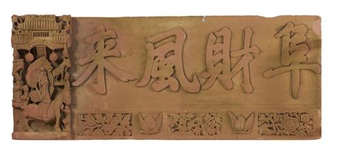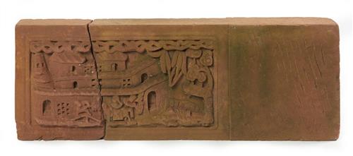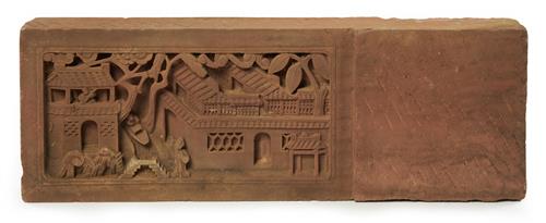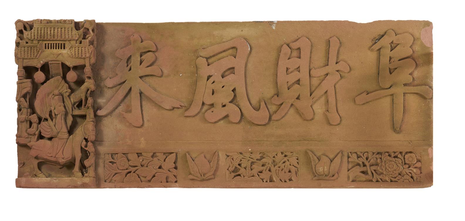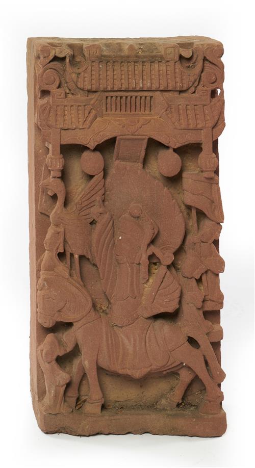 Carved from pink sandstone, the largest element decorated with four large characters. All elements decorated with figural scenes.