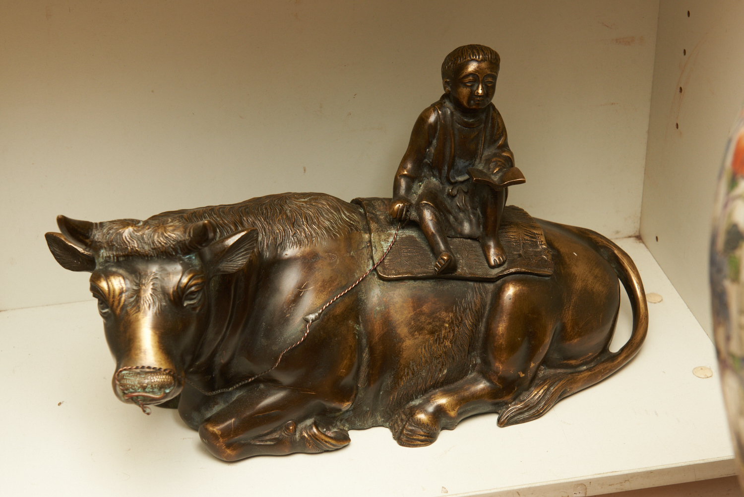 AN ASIAN BRONZE FIGURE OF LYING BUFFALO WITH RIDER, 45 CM WIDE, LEONARD JOEL LOCAL DELIVERY SIZE: MEDIUM