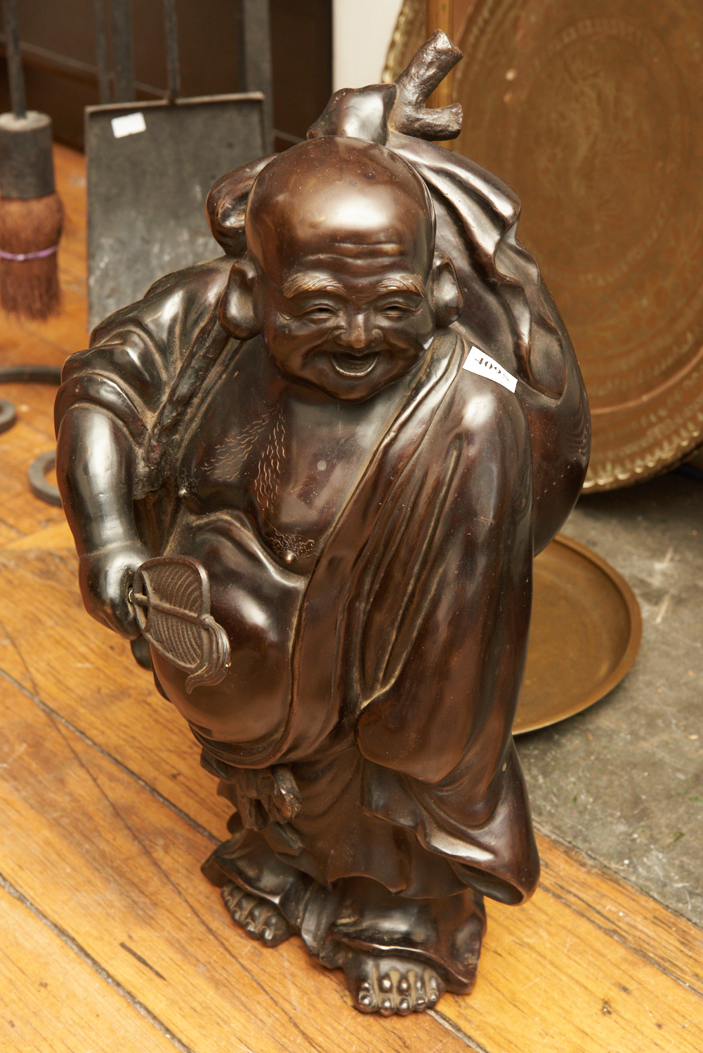 AN ORIENTAL BRONZE FIGURE OF HAPPY BUDDHA WITH FAN AND SACK ACROSS SHOULDER, 43 CM HIGH, LEONARD JOEL LOCAL DELIVERY SIZE: MEDIUM