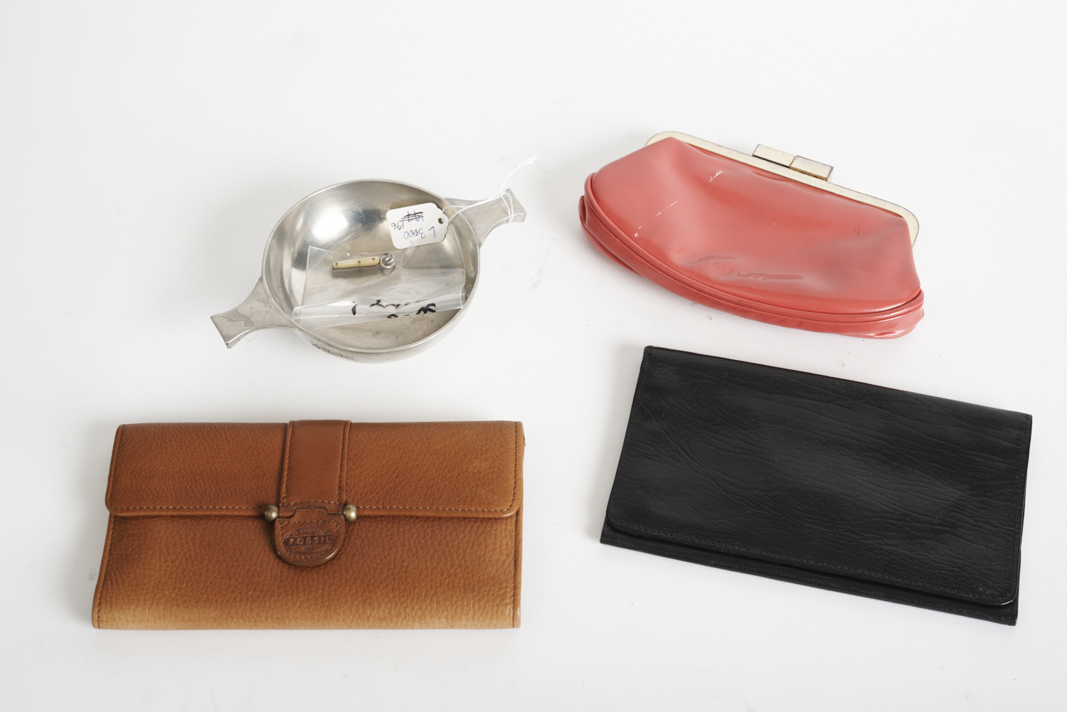 A GROUP OF COLLECTABLE ITEMS, COMPRISING THREE WALLETS, INCLUDING TED BAKER, A SCOTTISH TWO HANDLED WHISKEY CUP IN PEWTER BY EDWIN BLYDE AND A MINIATURE MOTHER OF PEARL MOUNTED PEN KNIFE, LEONARD JOEL LOCAL DELIVERY SIZE: SMALL