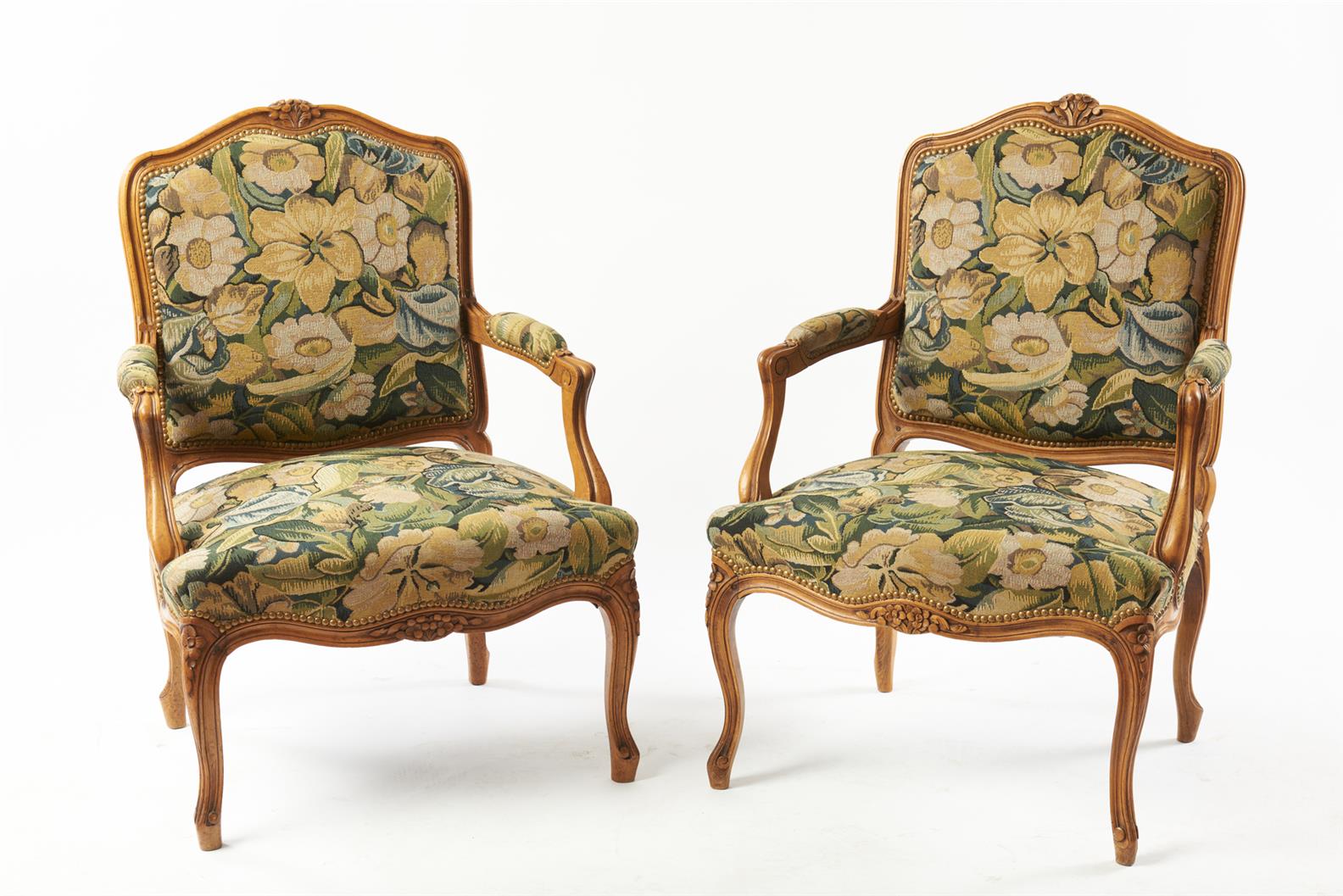 Of typical design with floral pattern upholstery, the frames accented with carved flowers