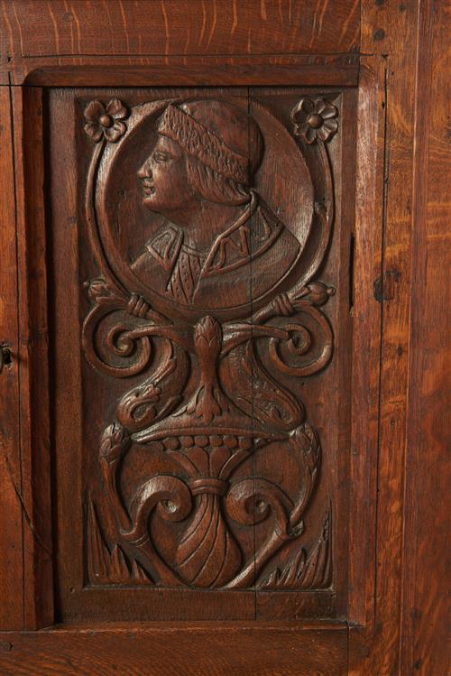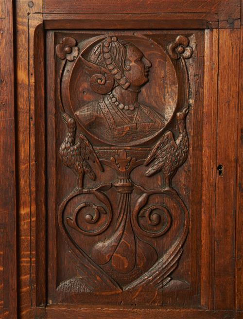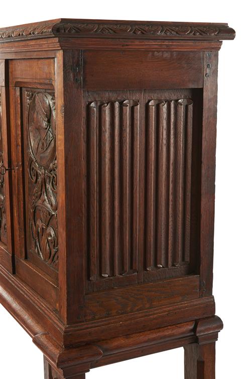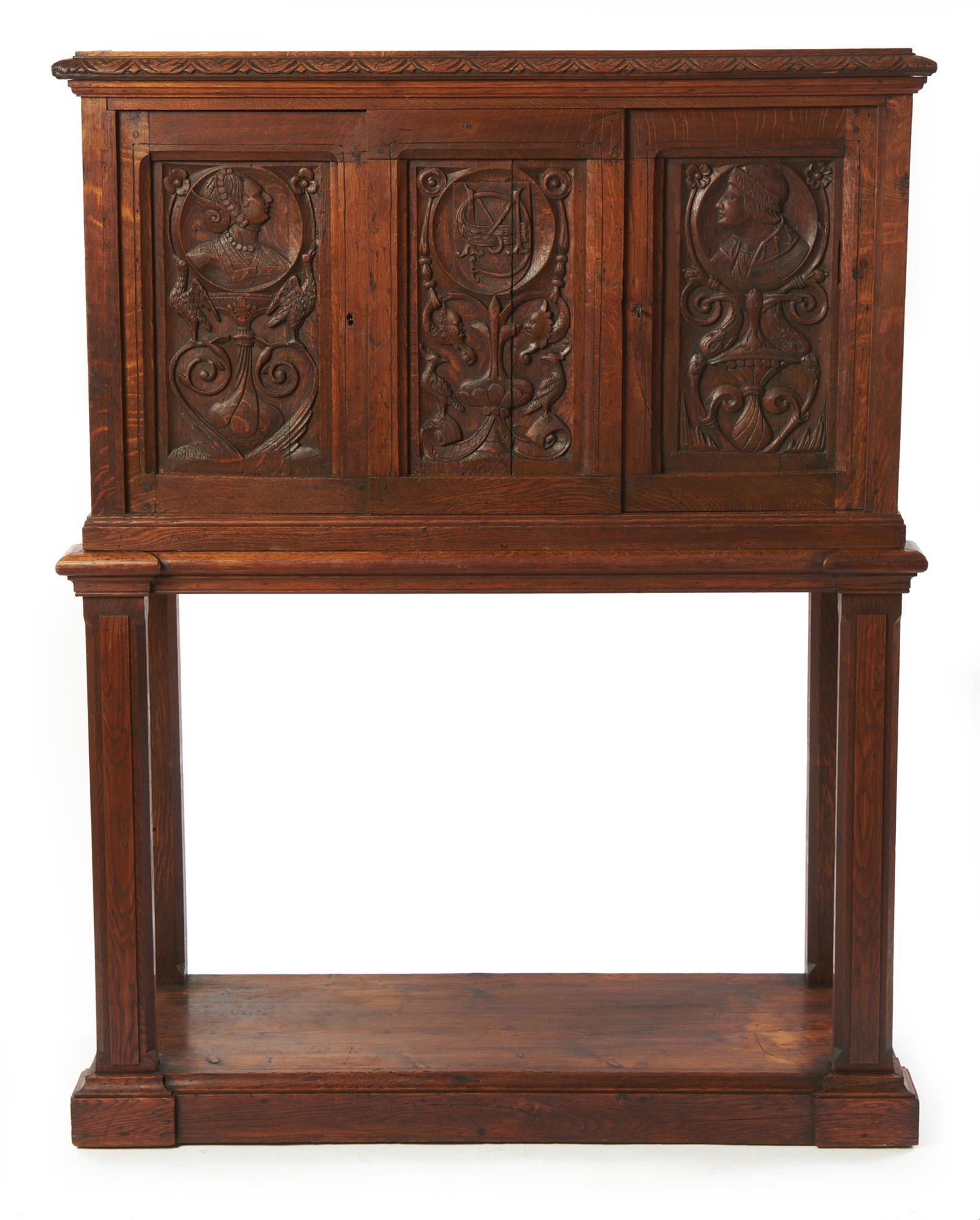 Of pegged construction, the moulded and carved top above two doors flanking a carved central panel, featuring a family crest, sitting upon a stand.