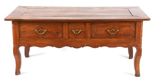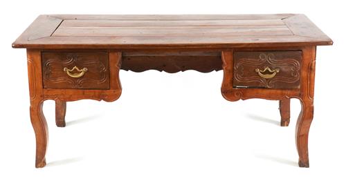 The plank top above two drawers and a knee hole, faux drawers to the front, all applied with brass handles