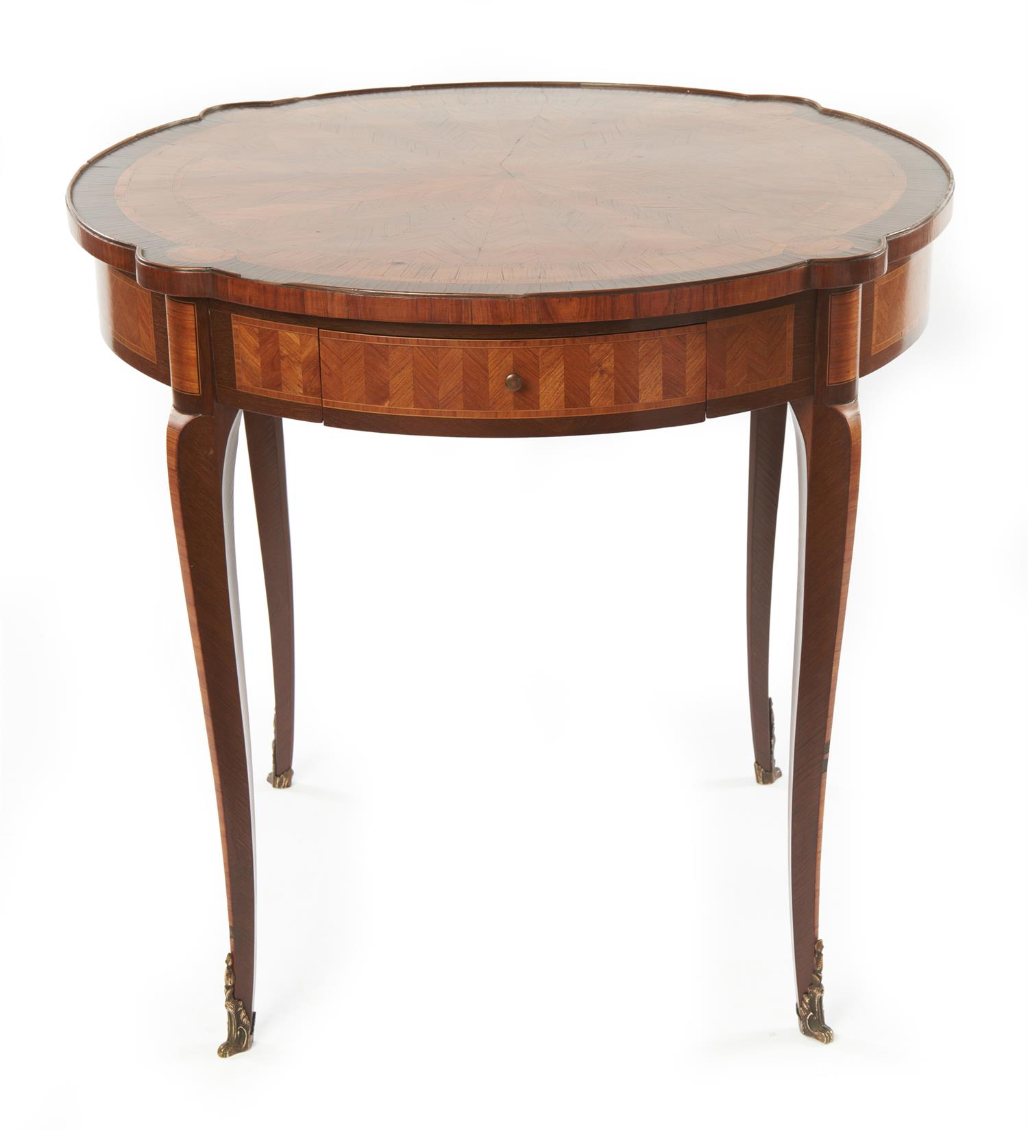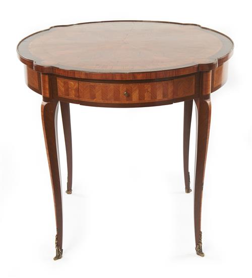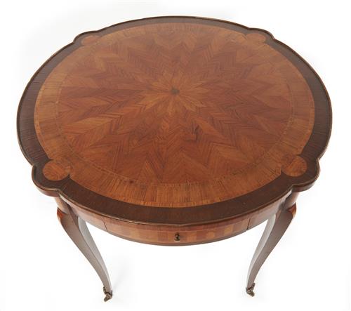 The shaped circular top with a kingwood starburst parquetry above a single drawer, standing on four elegently shaped legs.