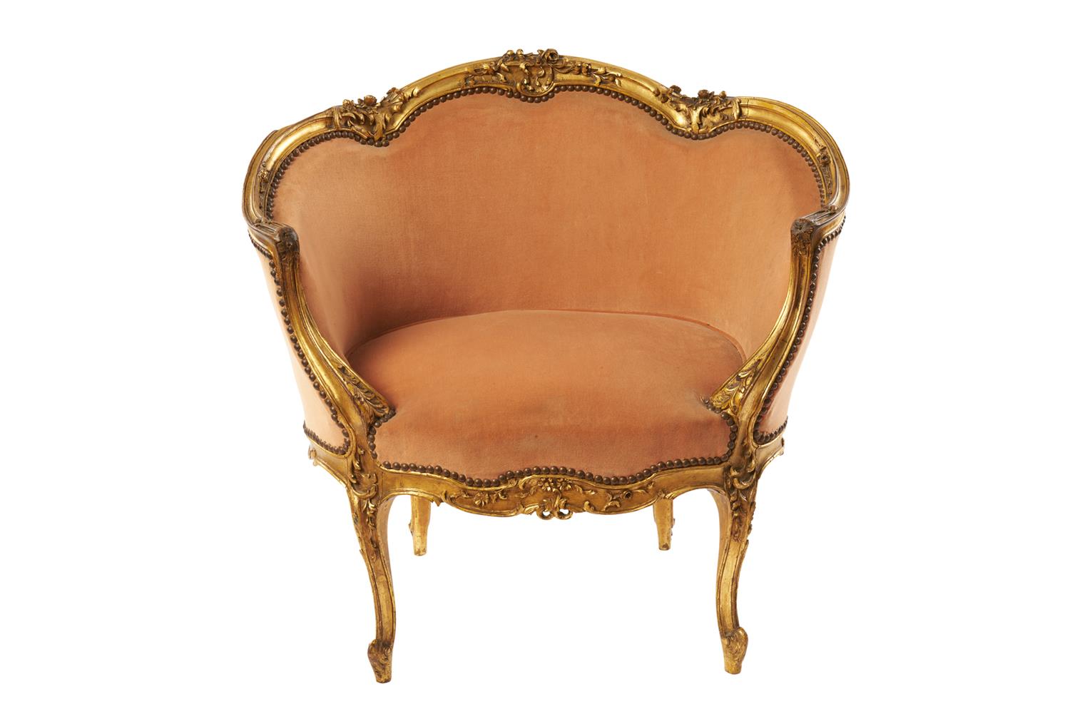 The decorative carved gilded frame covered in salmon velvet upholstery