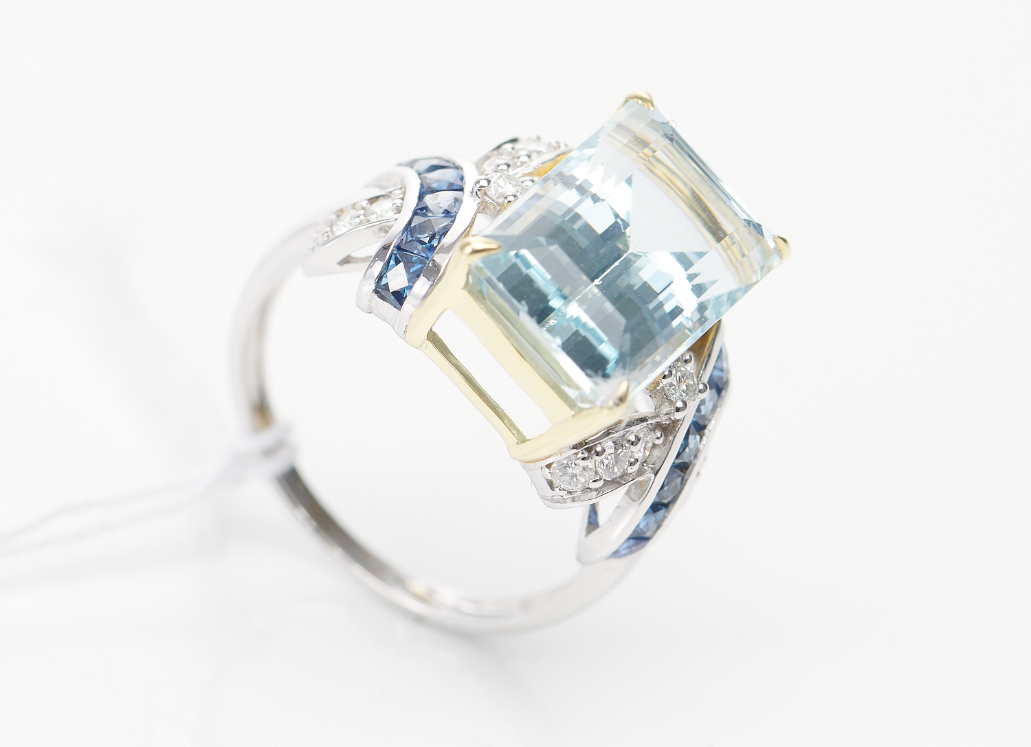 AN ART DECO STYLE RING IN 18CT WHITE GOLD, FEATURING A RECTANGULAR CUT AQUAMARINE WEIGHING 7.90CTS, SET SHOULDER WITH SAPPHIRES AND DIAMONDS, SIZE P, 6.2GMS