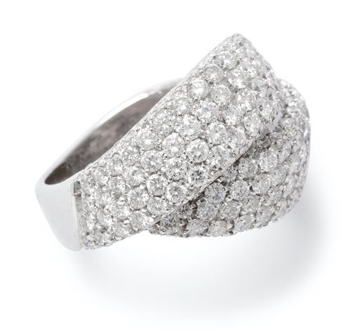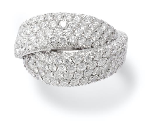 Of elliptical design, pavé-set to the top with brilliant-cut diamonds, the diamonds together weighing approximately 3.25 carats, size N.