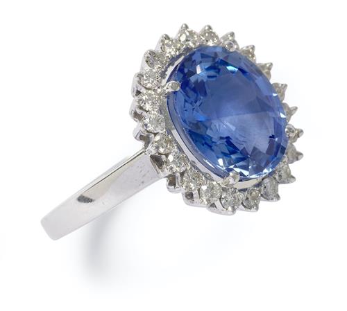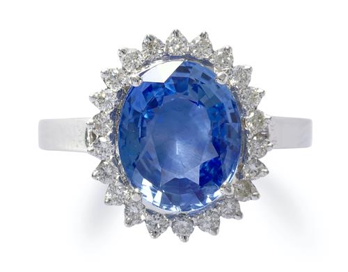 Of cluster design, centring an oval Sri Lankan sapphire, stated to weigh 6.13 carats, claw-set within a surround of brilliant-cut diamonds, size P.