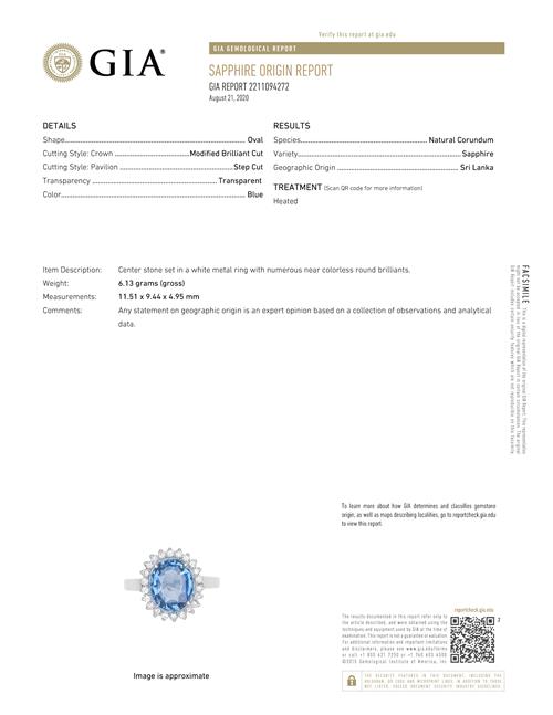 Accompanied by a GIA report numbered 2211094272, dated 21 August 2020, stating that the 6.13 carat sapphire is natural, of Sri Lanka origin.