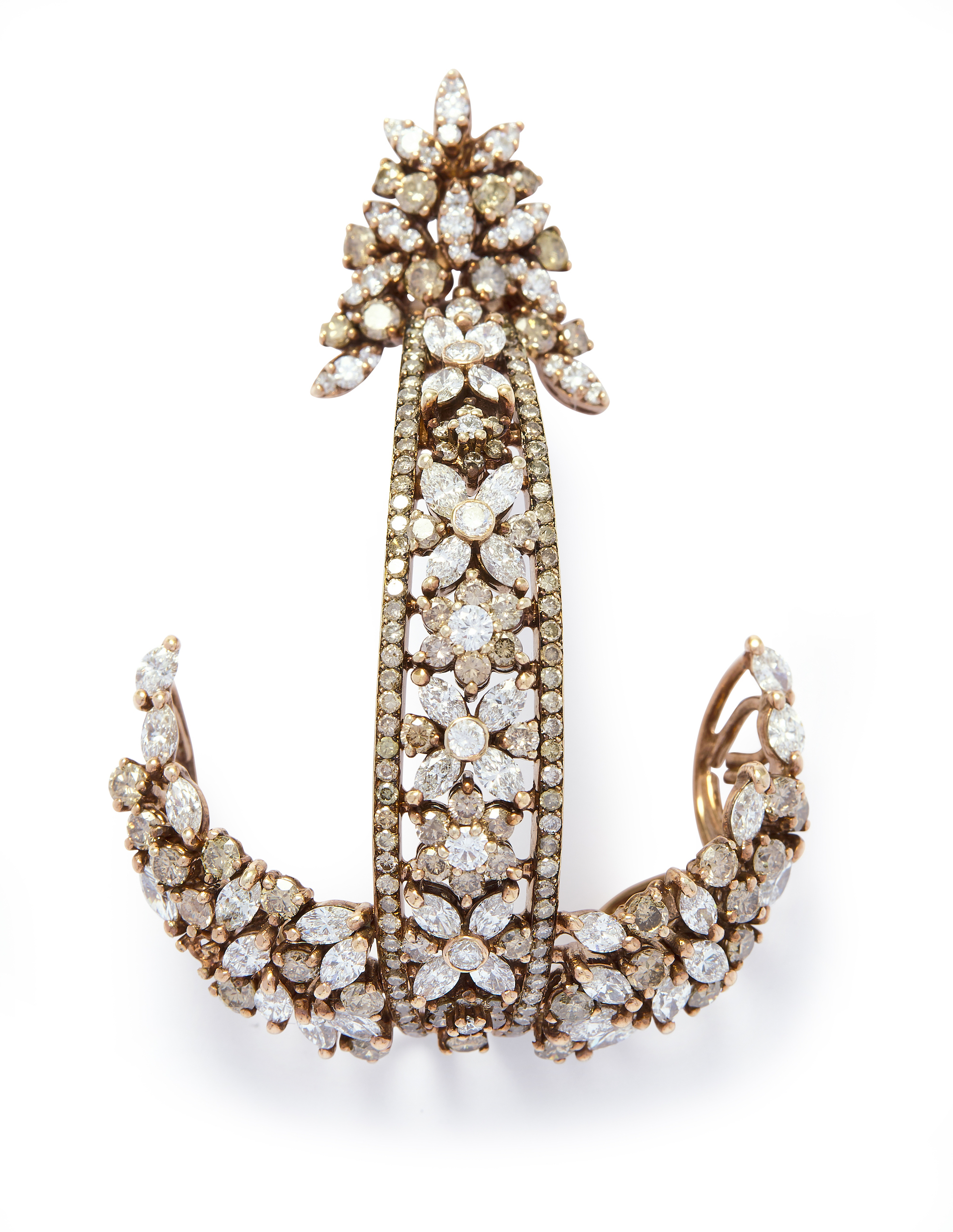 Modelled as an openwork anchor, decorated with near colourless and tinted brown, brilliant and marquise-shaped diamonds surmounted by a similarly set cluster, the diamonds together weighing approximately 7.12 carats, length approximately 57mm.