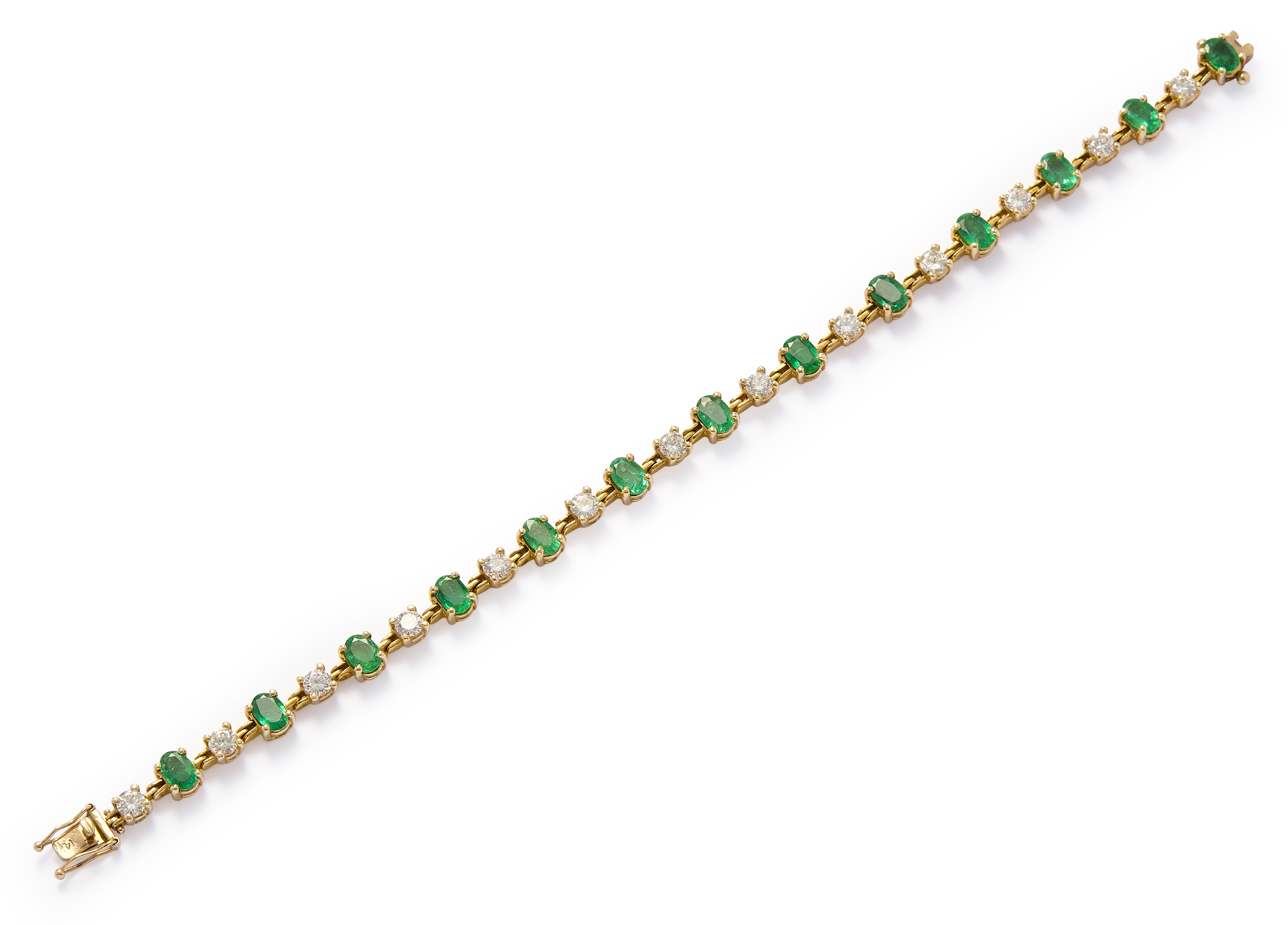 Designed as a line of 13 claw-set oval emeralds alternating between brilliant-cut diamond spacers, the emeralds and diamonds together weighing approximately 4.00 carats and 2.60 carats respectively, length approximately 190mm.