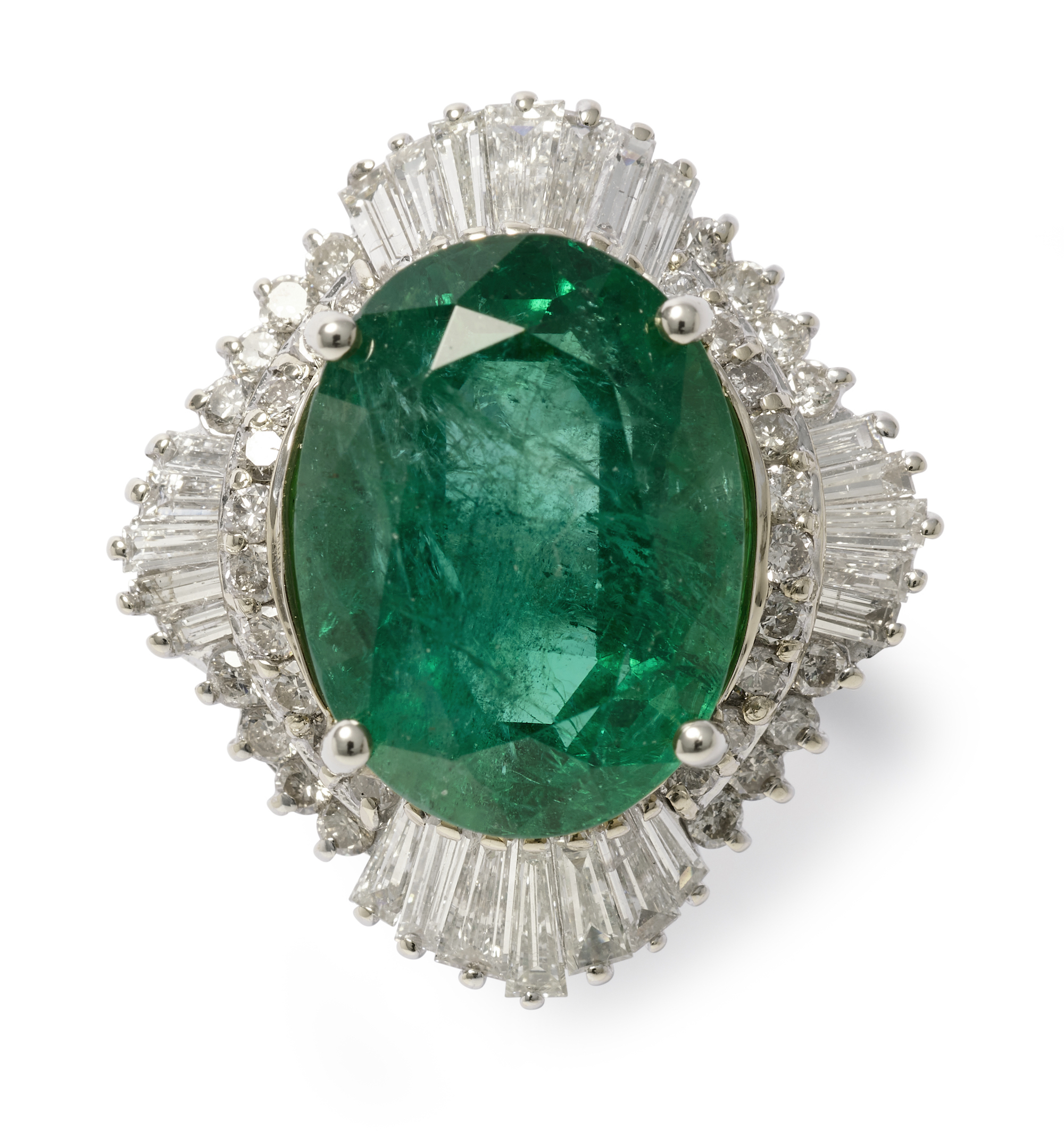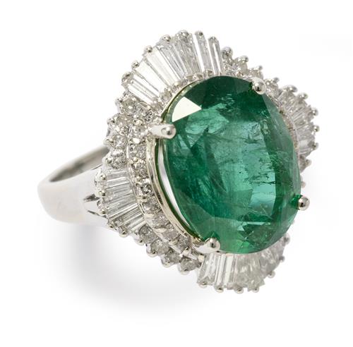 Of cluster design, centring a claw-set oval emerald weighing approximately 9.98 carats, framed by an undulating surround of baguette and brilliant-cut diamonds together weighing approximately 1.50 carats, size P.