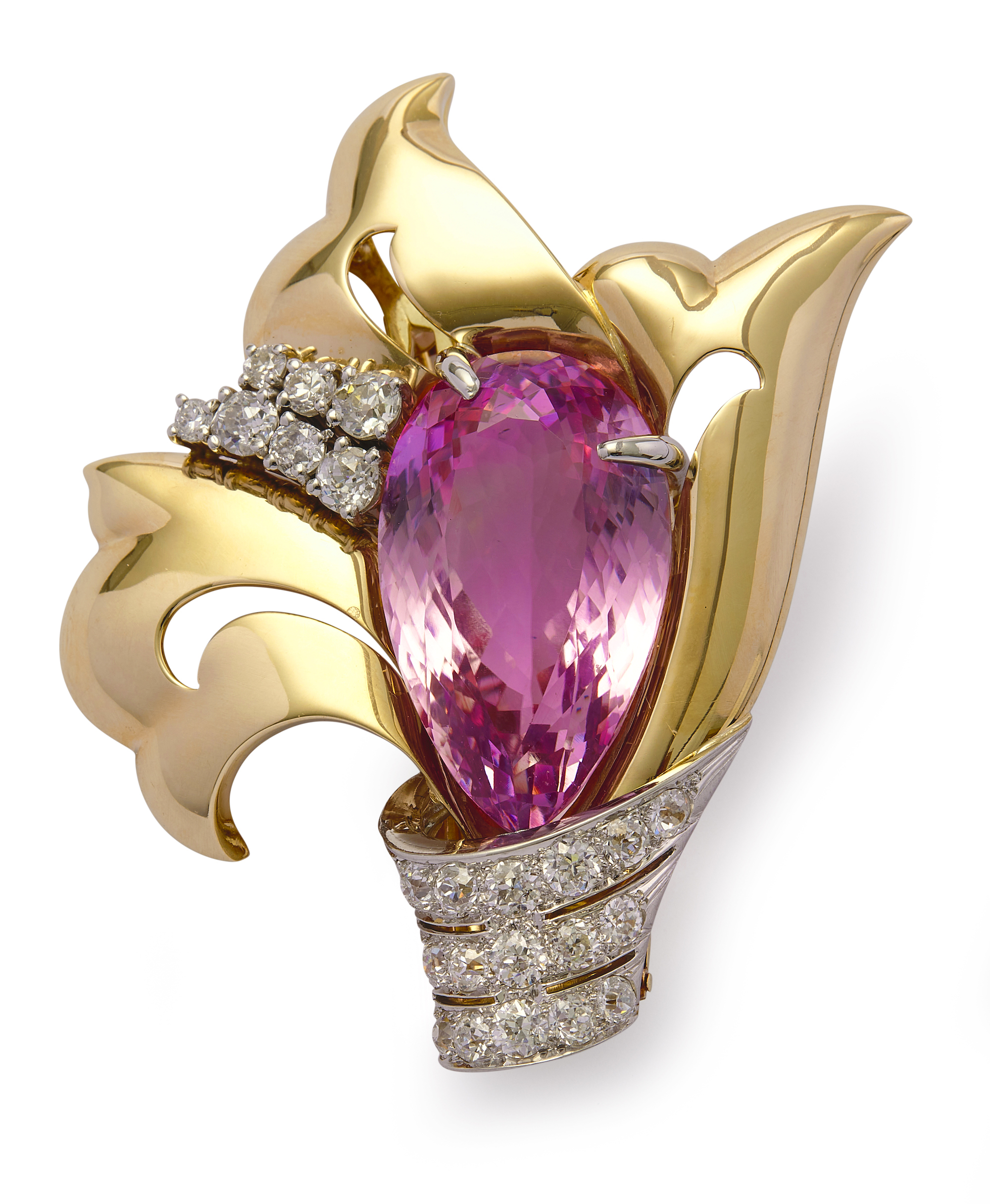 Modelled as a stylised floral bouquet centring a pear-shaped kunzite weighing approximately 43.00 carats accented with brilliant-cut diamonds together weighing approximately 3.00 carats, approximately 60mm x 50mm, trombone clip fitting.