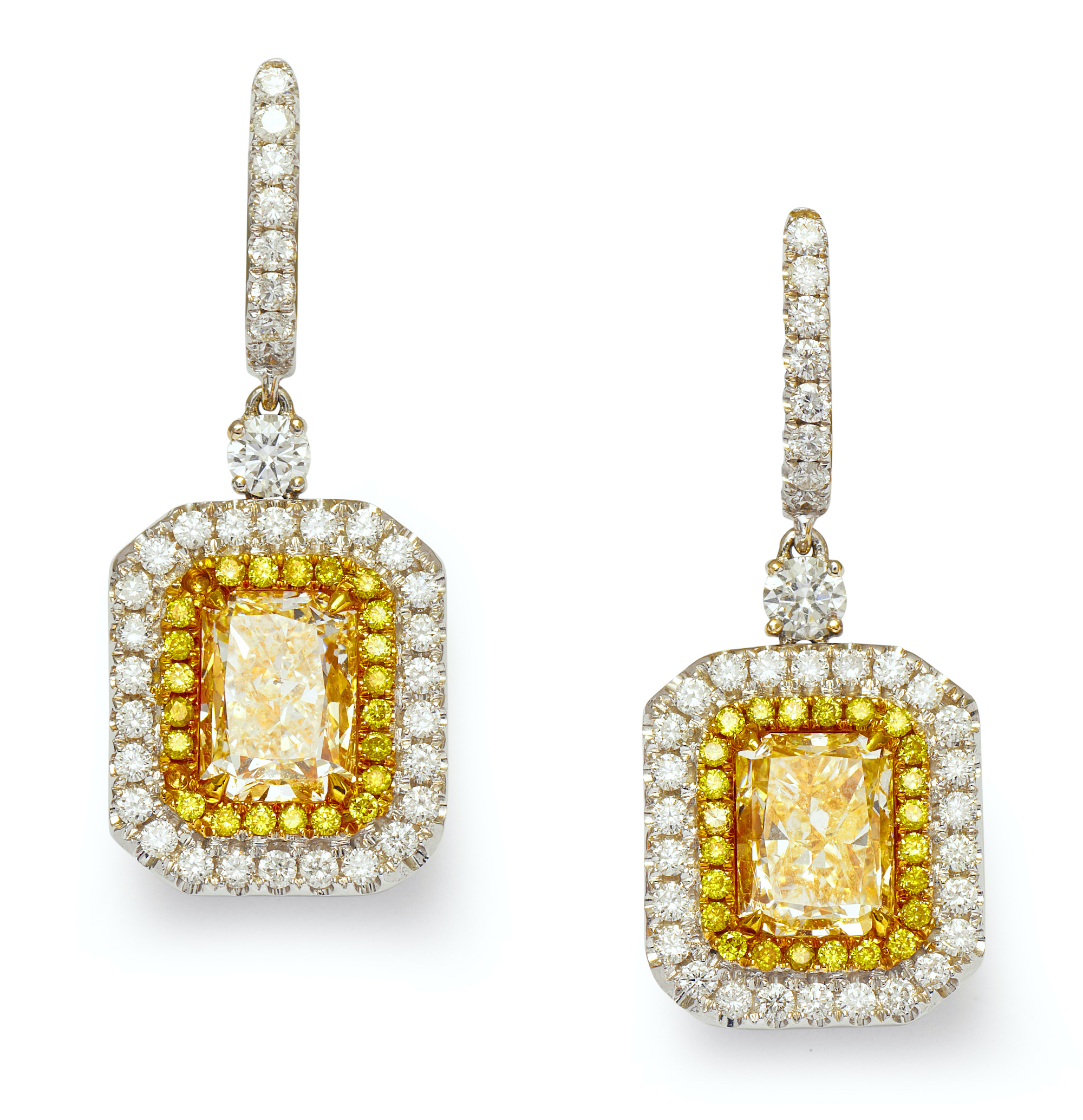 Each terminating on a cluster swing drop claw-set with a radiant-cut natural fancy yellow diamond together weighing approximately 3.06 carats, framed by a line of fancy intense yellow brilliant-cut diamonds further bordered by near colourless brilliant-cut diamonds supported from an elliptical hoop pavé-set with diamonds between a diamond connector, the small diamonds together weighing approximately 0.97 carat, length approximately 25mm.