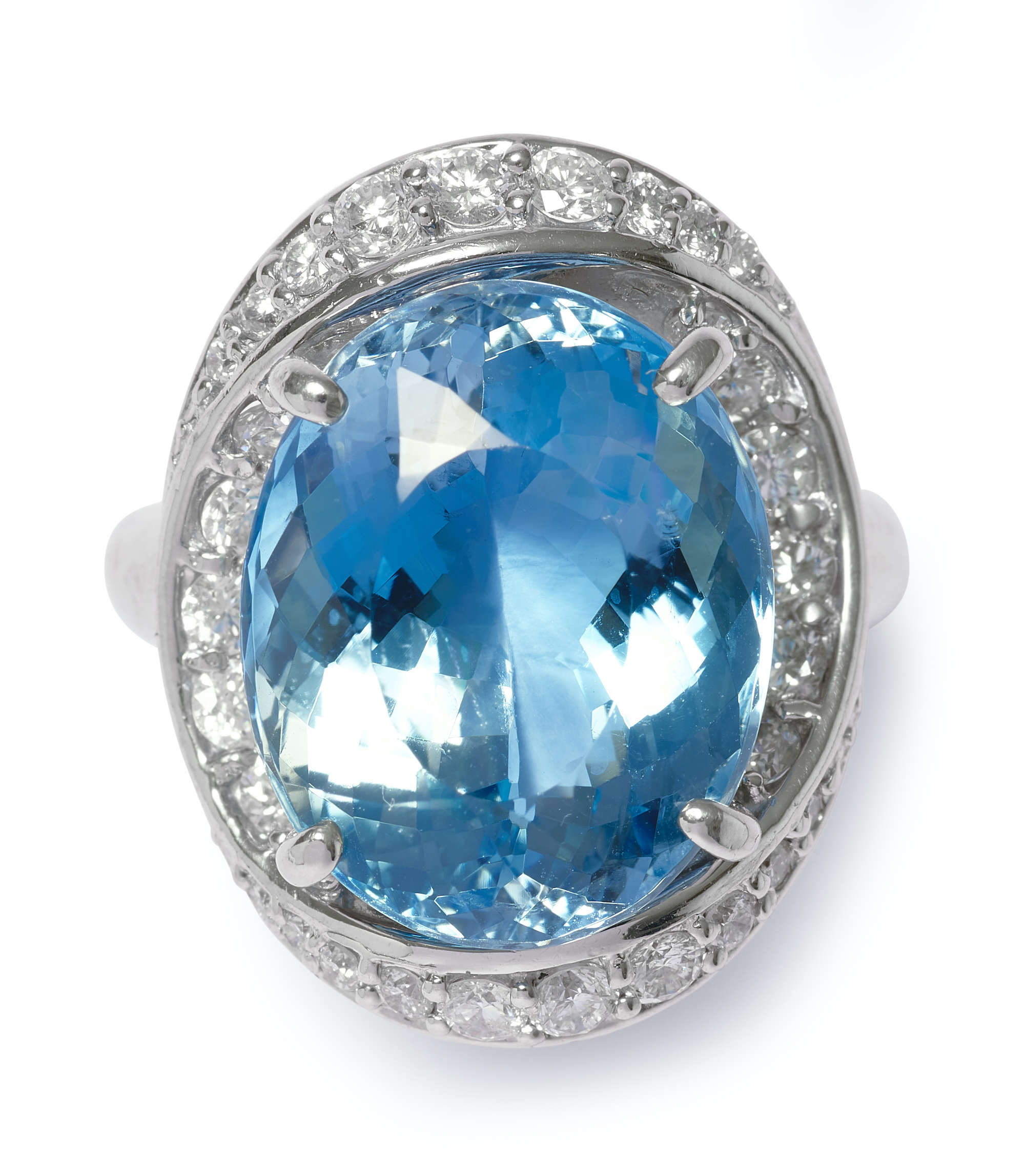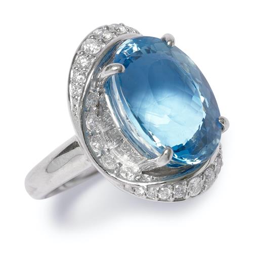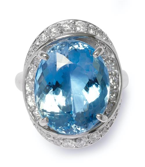 Centring a claw-set oval aquamarine stated to weigh 13.08 carats, framed by an elliptical bezel pavé-set with brilliant-cut diamonds, the diamonds together weighing approximately 1.09 carats, size L.