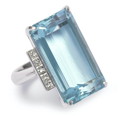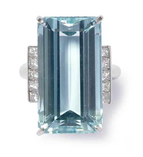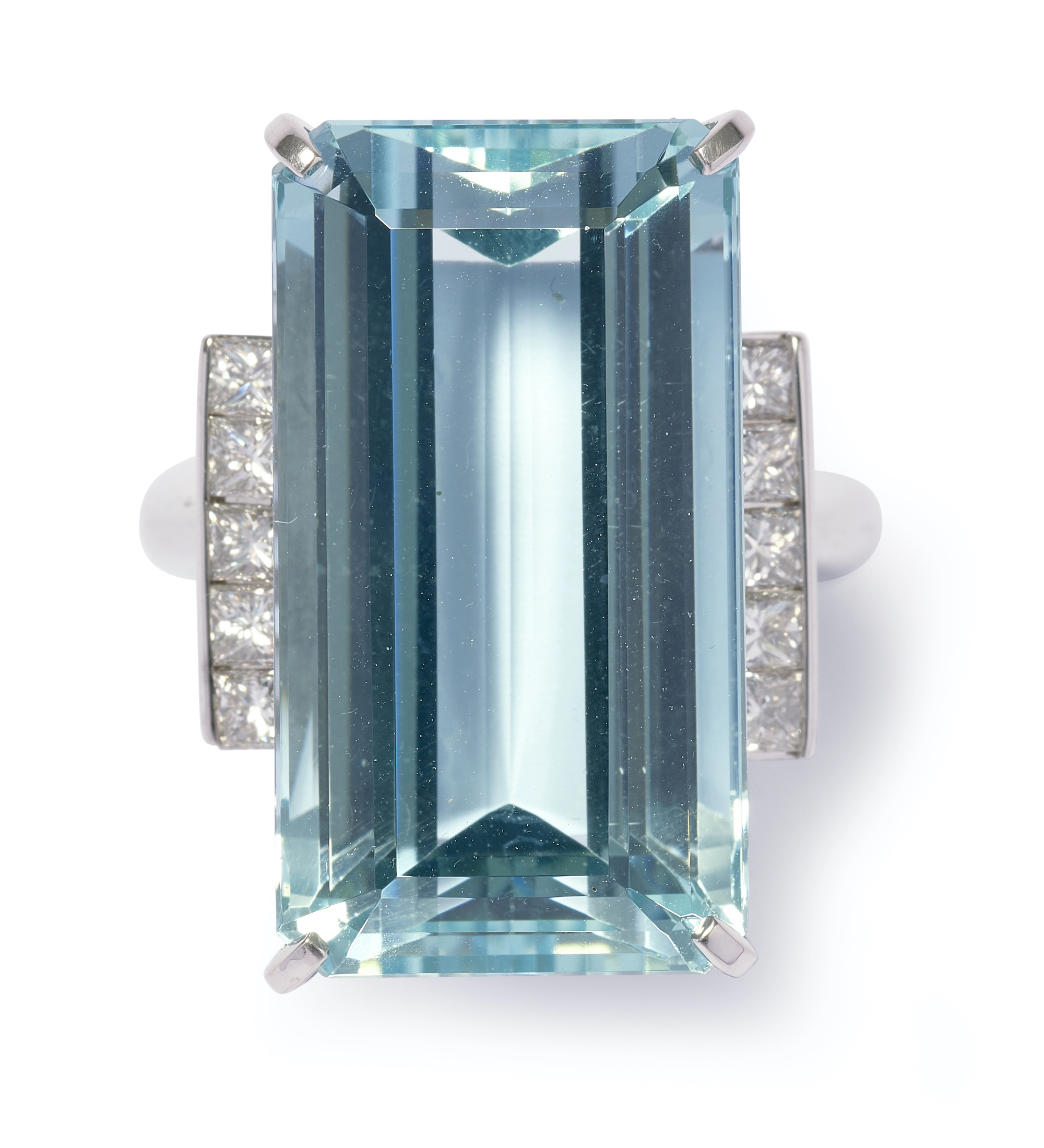 Claw-set with a rectangular step-cut aquamarine weighing approximately 25.17 carats, flanked by a line of princess-cut diamonds together weighing approximately 0.70 carat, size M.