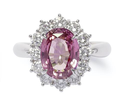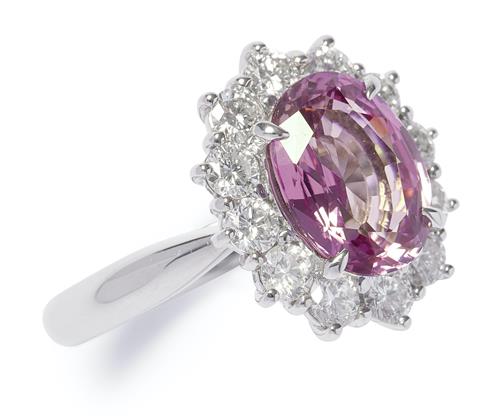 Of cluster design, centring an oval pink sapphire weighing approximately 3.25 carats, claw-set within a surround of brilliant-cut diamonds, the diamonds together weighing approximately 0.95 carat, size L1/2.