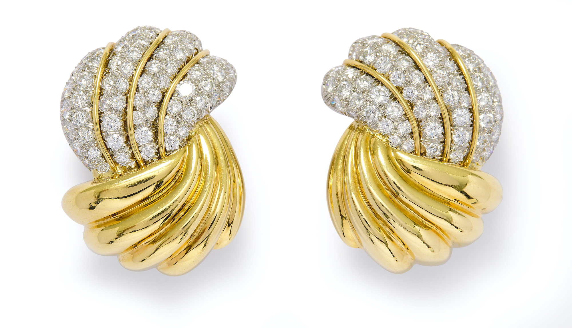 Each of architectural design partially pavé-set with brilliant-cut diamonds between wire dividers, the diamonds together weighing approximately 4.00 carats, length approximately 32mm, stamped with maker's mark T, post and clip fittings.