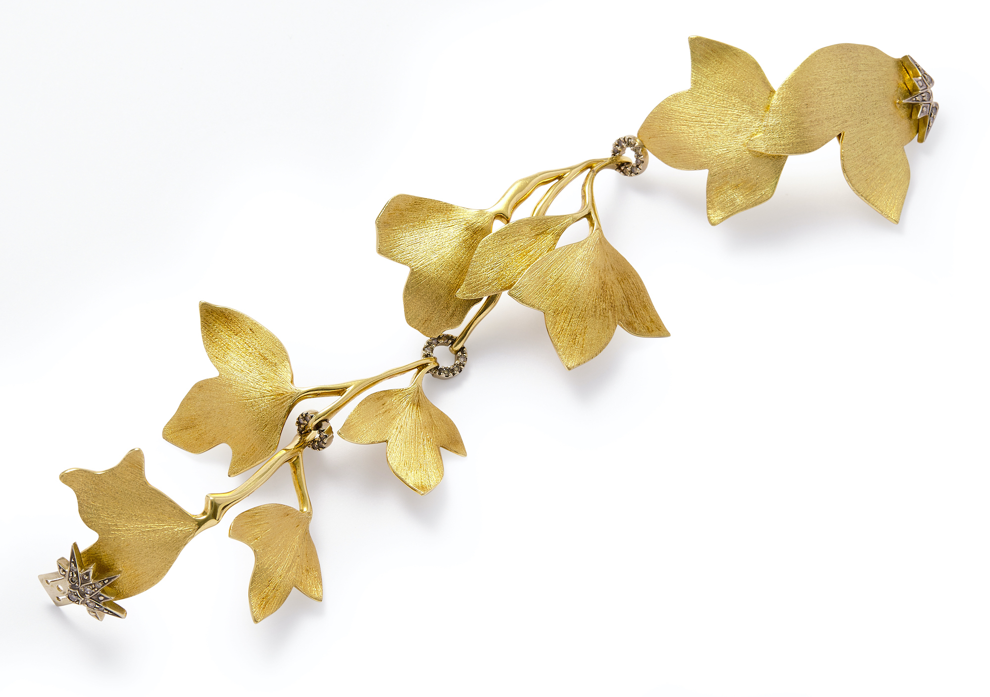 Composed of a line of textured foliate motifs between annular connectors pavé-set with fancy brown brilliant-cut diamonds completed by a box clasp surmounted by a star motif similarly set, length approximately 180mm, maker's mark for H. Stern.