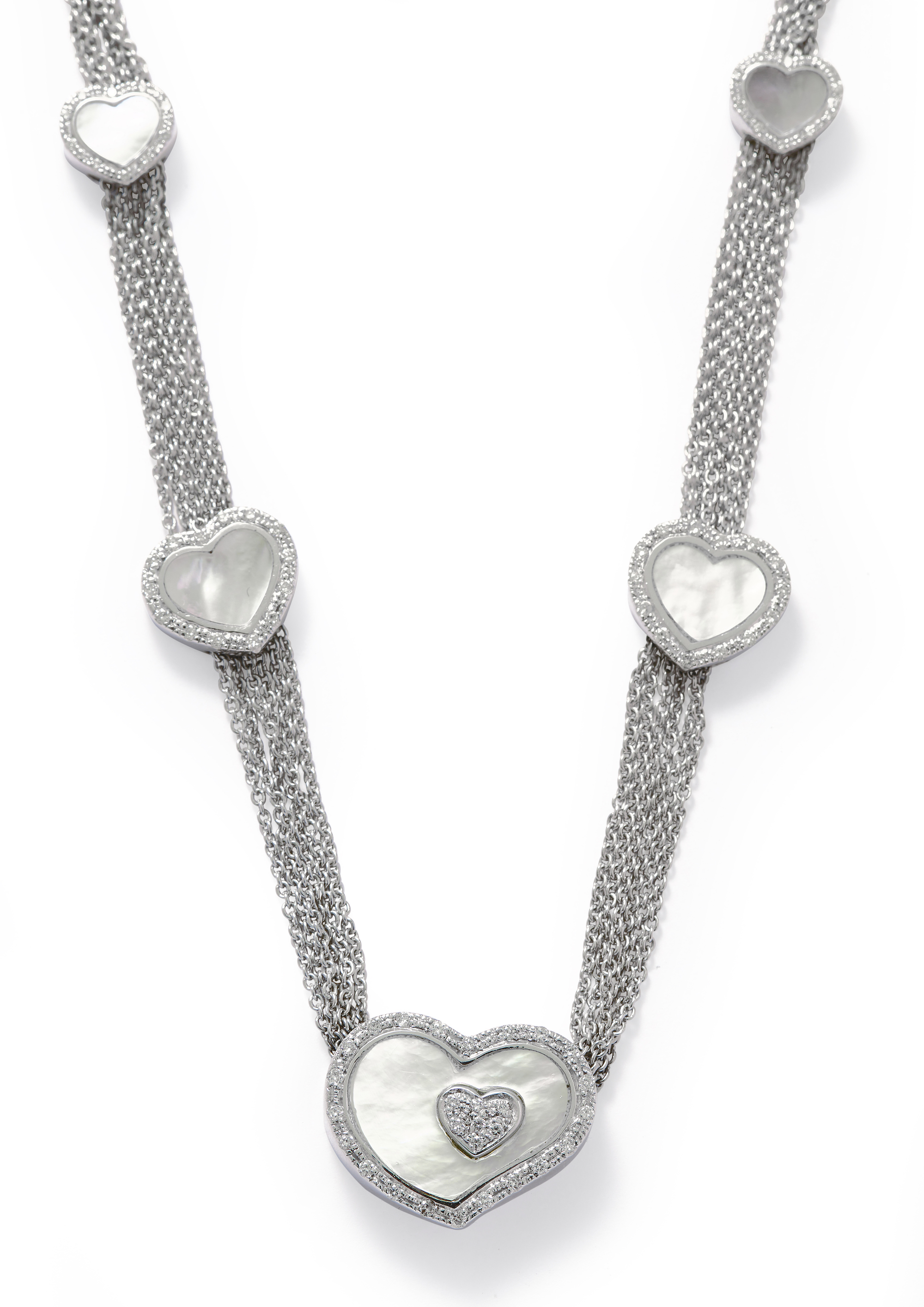 Comprising six lines of trace chain decorated at intervals by heart-shaped clusters centring a mother-of-pearl plaque framed by brilliant-cut diamonds together weighing approximately 0.70 carat, length approximately 420mm.