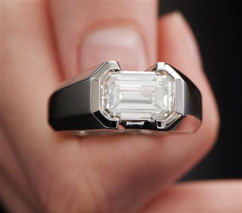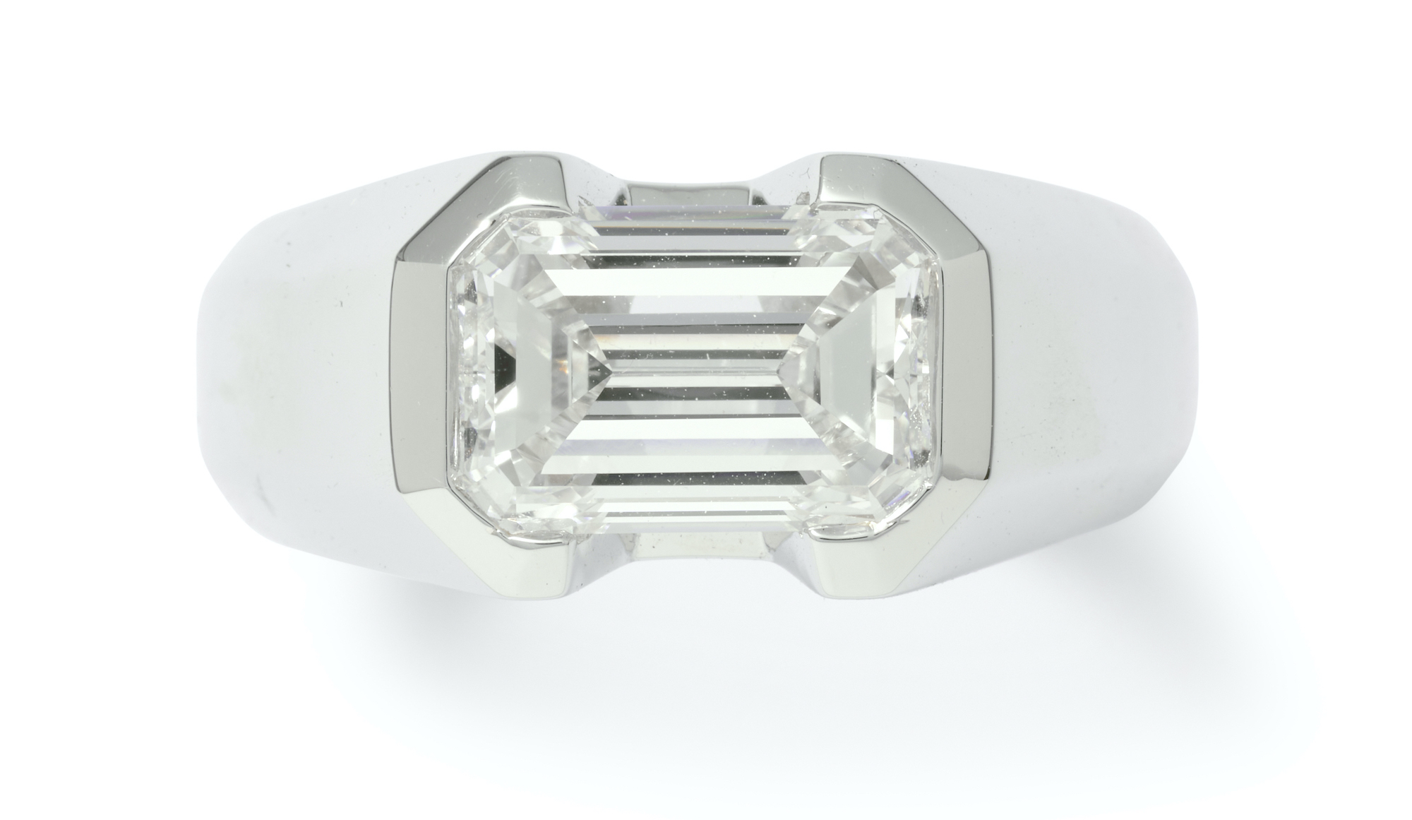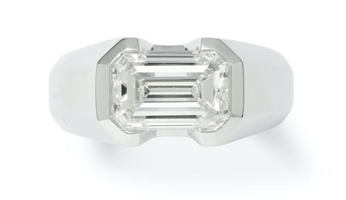 Collet-set with an emerald-cut diamond weighing 5.01 carats, maker's mark 'HW' for Harry Winston, size X.
