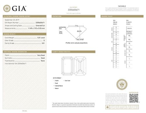 a GIA report numbered 2205605671, dated 23 September 2019, stating that the 5.01 carat diamond is G colour, VS1 clarity, laser inscribed;