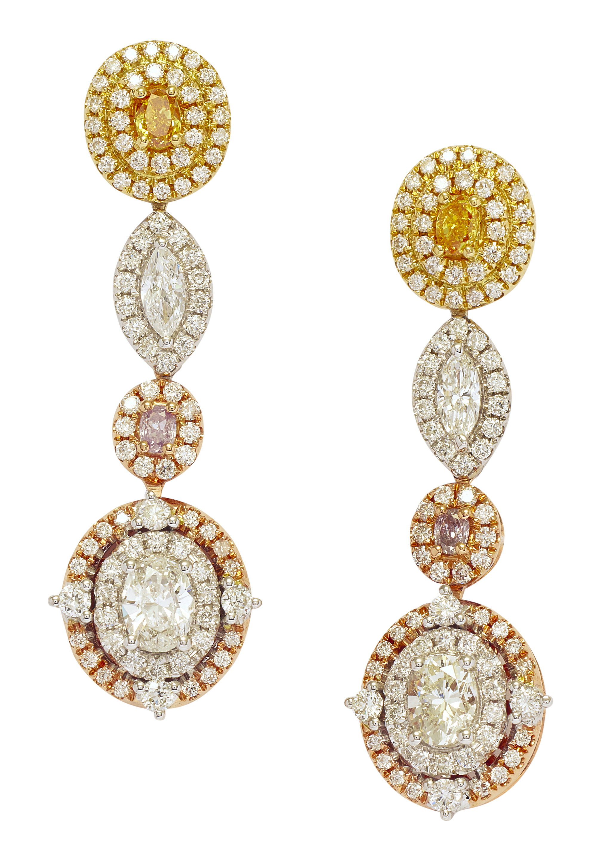 Each terminating in a cluster swing drop decorated with near colourless oval and brilliant-cut diamonds supported from a similarly set surmount centring an oval natural fancy yellow diamond framed by near colourless diamonds between a line of clusters decorated with a fancy pink oval and near colourless marquise and brilliant-cut diamonds, the diamonds together weighing approximately 2.10 carats, length approximately 35mm, post fittings.