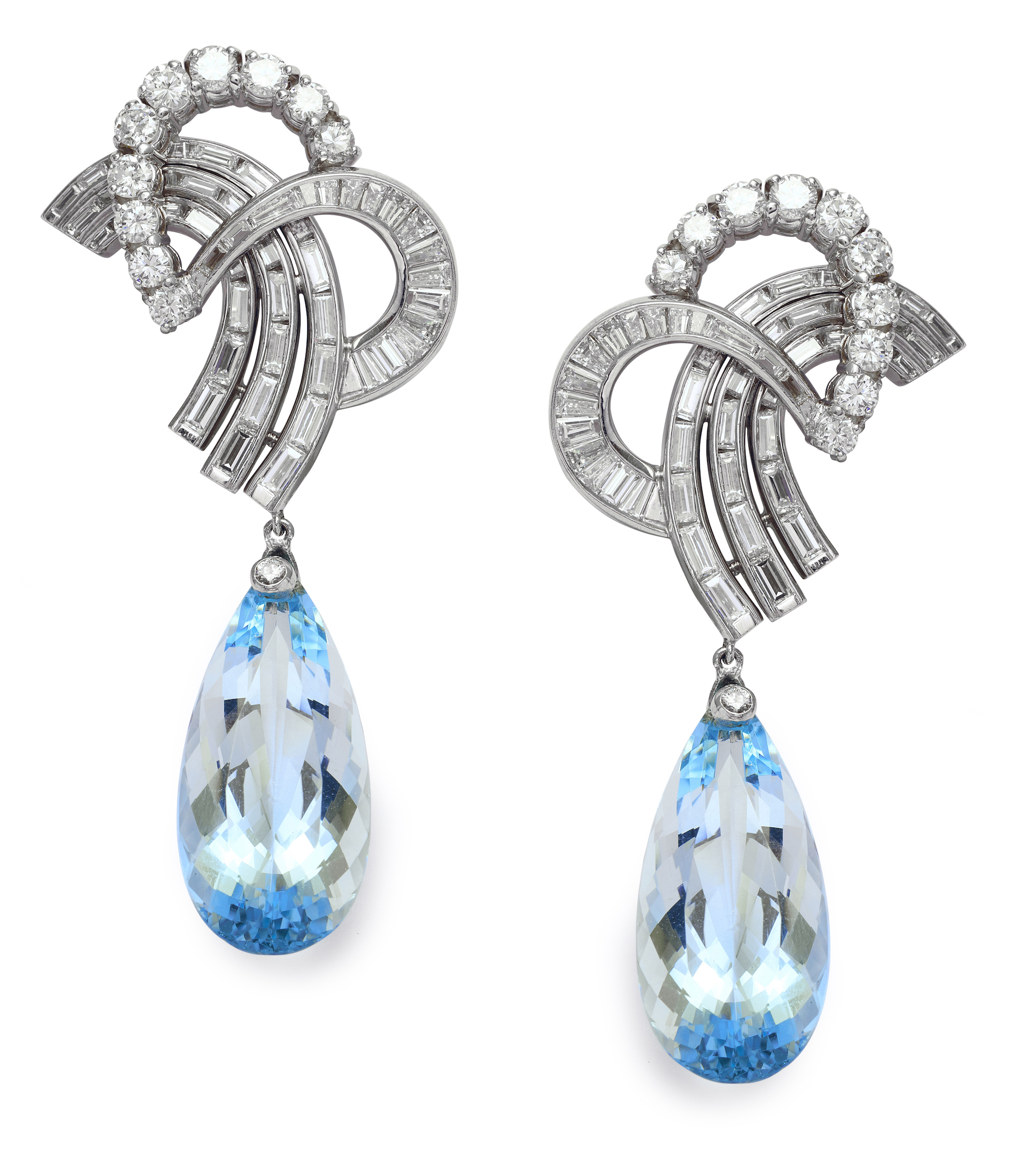 Each surmount of openwork scroll design decorated with baguette and brilliant-cut diamonds supporting a pear-shaped aquamarine drop, mounted in platinum, the aquamarine and diamonds together weighing approximately 24.00 carats and 5.00 carats respectively, length approximately 55mm, post and clip fittings.