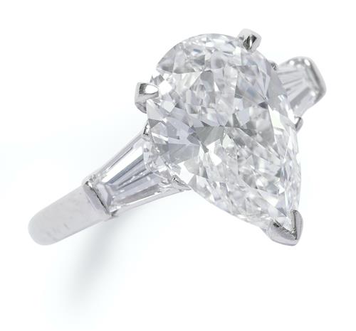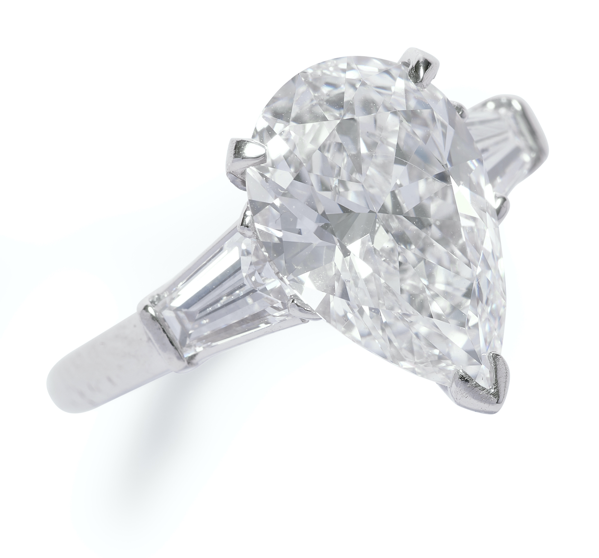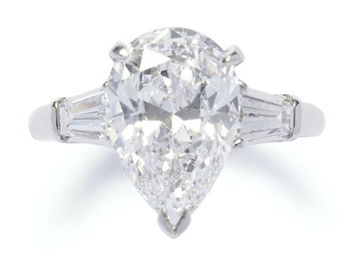 The pear-shaped brilliant-cut diamond weighing approximately 3.04 carats is claw-set between a pair of baguette diamond shoulders together weighing approximately 0.30 carat, signed Van Cleef & Arpels.