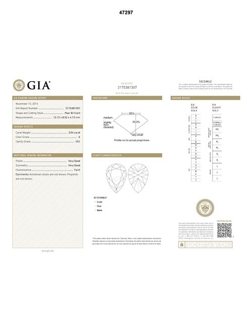 Accompanied by a GIA report numbered 2175381307, dated 10 November 2015, stating that the 3.04 carats diamond is E colour, VS1 clarity, laser inscribed.