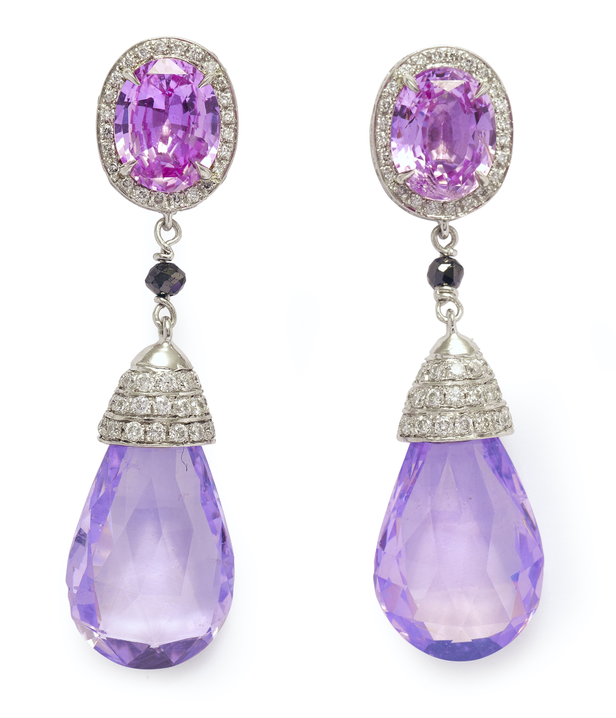 Each surmount of cluster design centring a claw-set oval pink sapphire framed by brilliant-cut diamonds supporting a briolette lavender spinel surmounted from a bell-shaped cap pavé-set with near colourless diamonds between a black diamond bead connector, mounted in platinum, the sapphires, spinel and diamonds together weighing approximately 3.61 carats, 9.88 carats, and 1.08 carats respectively, length approximately 35mm, post fittings.