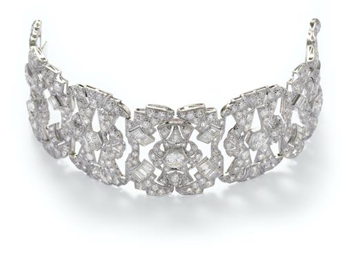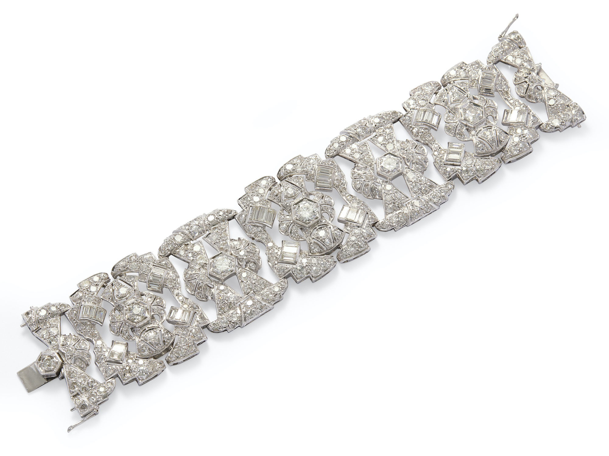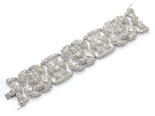 The Art Deco bracelet is modelled as an articulated line of openwork geometric links decorated with baguette and circular-cut diamonds together weighing approximately 34.66 carats, circumference approximately 175mm.