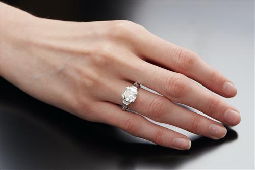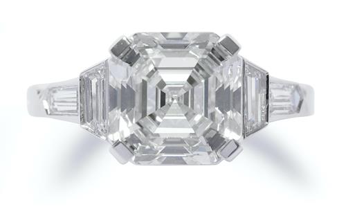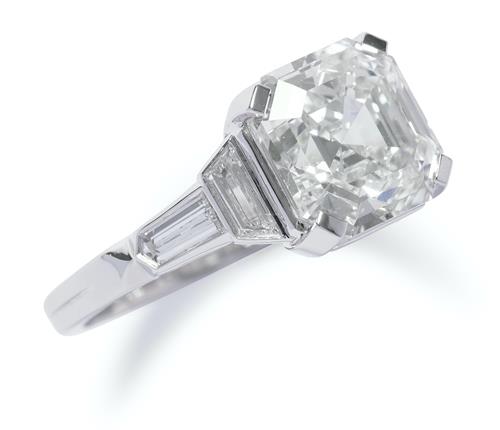 The square emerald-cut diamond weighing 4.17 carats, is claw-set between shoulders decorated with four tapered baguette diamonds together weighing approximately 0.69 carat, size M.